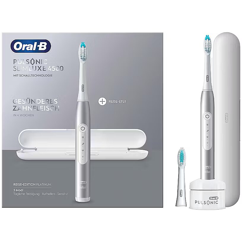 LongSummaryDescription - Oral-B Pulsonic Slim Luxe 4500. Purpose: Adult, Toothbrush type: Sonic toothbrush, Teeth brushing modes: Daily care, Sensitive, Whitening. Power source: Battery, Battery type: Built-in battery. Number of handles included: 1 pc(s), Number of brush heads included: 2 pc(s)