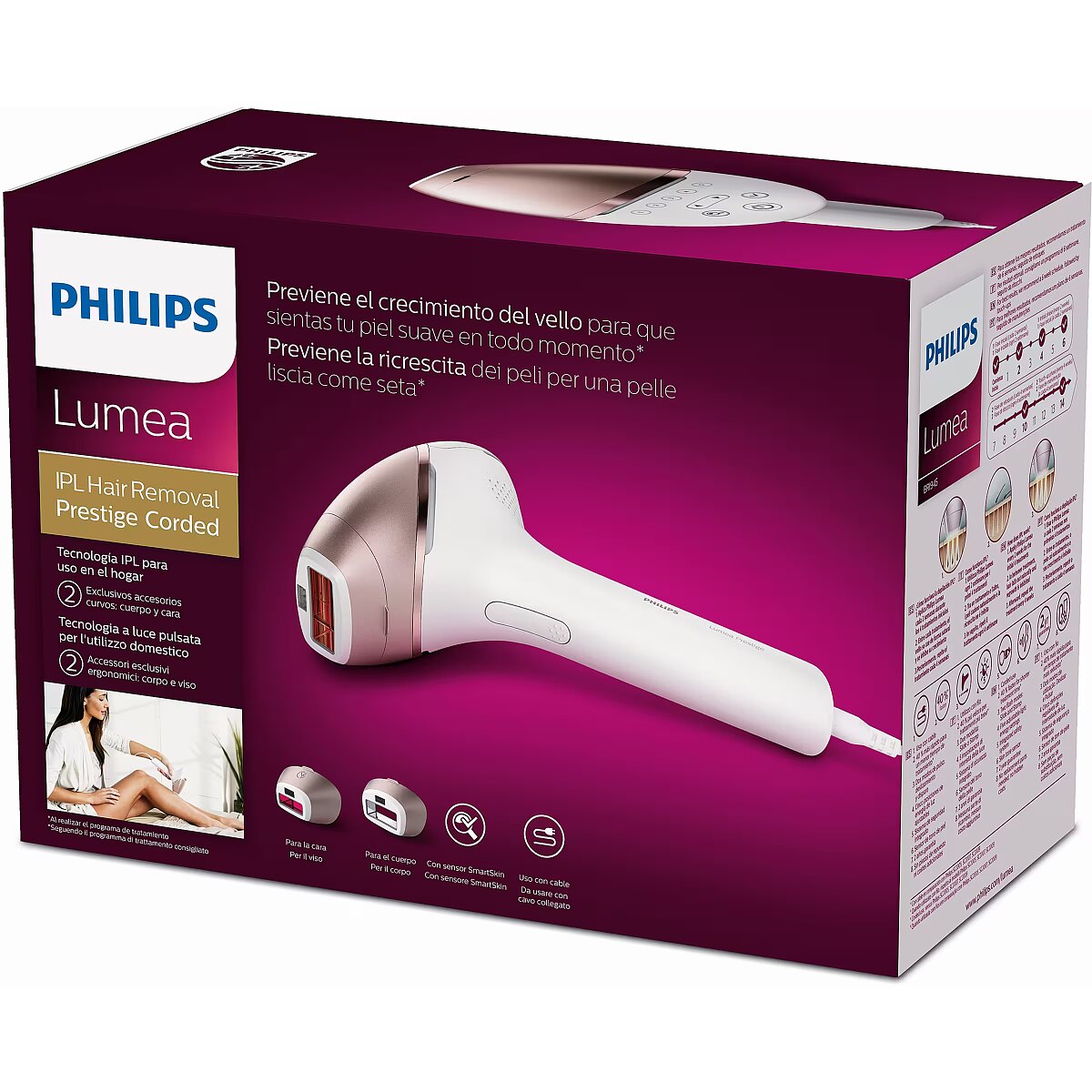 LongDesc - Expert IPL technology at-home, developed with dermatologistsIPL stands for Intense Pulsed Light. Philips Lumea applies gentle pulses of light to the hair root, putting the follicle into a resting phase. As a consequence, the amount of hair your body grows gradually decreases. Repeating the treatment leaves your skin beautifully hair free and touchably smooth. Treatment to prevent hair regrowth is safe and gentle, even on sensitive areas. Philips Lumea is clinically tested and developed with dermatologists for easy and effective treatment, from the comfort of your own home.Proven safe and effective treatmentObjective studies show up to 92% hair reduction in as little as 3 treatments**. The first 4 treatments must be carried out every 2 weeks, after which you should already be able to see the desired results. To maintain your results, simply touch up every 4 weeks. After just 8 touch up treatments you can be hair-free for 6 months* To enlarge this picture, please click on the image in the image gallery at the top of this page.Suitable for a wide variety of hair and skin typesPhilips Lumea Prestige works effectively, easily and safely on a wide variety of hair and skin types. It works on naturally dark blonde, brown and black colored hairs and on skin tones from very white to dark brown. As with other IPL based treatments, Philips Lumea cannot be used to treat white / grey, light blonde or red hair and is not suitable for very dark skin. This is due to the high contrast required between the pigment in hair color and pigment in the skin tone.SenseIQ technology for personalized hair removal Senses. Lumea’s SmartSkin sensor detects your skin tone and indicates the most comfortable light setting for you. Adapts. Intelligent attachments adapt programs tailored for each body area. Cares. Co-developed with dermatologists and inspired by you for gentle, long-lasting hair removal, even on sensitive areas***.Intelligent attachments adapt programmes for each body areaYour body is unique. And its skin, curves and contours should be treated uniquely too. Lumea's total-body attachments are shaped to perfectly fit every curve and will adapt programmes tailored to each body area. Treatment windows are designed to maximise contact with your skin to ensure light doesn't escape, enabling effective and gentle treatments even on delicate or sensitive areas.Body attachment with curved-in designThe intelligent body attachment has our largest treatment window at 4.1 cm2 so it's perfect for fast treatment of larger body areas like legs, arms and stomach. The curved-in design closely follows your body's contours for maximum skin contact. The click-on attachment adapts a tailored programme specifically for your body areas. 83% of women were satisfied with hair reduction on legs****.Precision face attachment with extra filterThe face attachment has been thoughtfully designed to have a small, flat 2 cm2 window so you can effectively and gently treat hair on your face. Ideal for your upper lip, chin or jawline, the attachment also has an extra integrated filter. When added to the device, the intelligent attachment automatically adapts the light treatment for your face. 84% of women were satisfied with hair reduction on face****.With SmartSkin sensorPhilips Lumea Prestige has 5 energy settings and makes it easy for you to choose one thanks to the SmartSkin sensor. The SmartSkin sensor indicates the most comfortable setting for women with a similar skin tone to yours.FREE Lumea App for a personal coach at your fingertipsThe Lumea App is free to download and offers a unique and personalised IPL experience – just for you. It is your very own personal coach to ensure you are getting the most out of your Lumea and using it in the correct way to achieve long-lasting results. The App helps you create your personalised treatment schedule per body area, with tips and advice during each treatment. All you need to do is check the app regularly to make sure you are up to date with any notifications or reminders.No replacement parts, no hidden costsPhilips Lumea is a complete solution that comes ready to work, straight out of the box. No refill cartridges or gels needed.