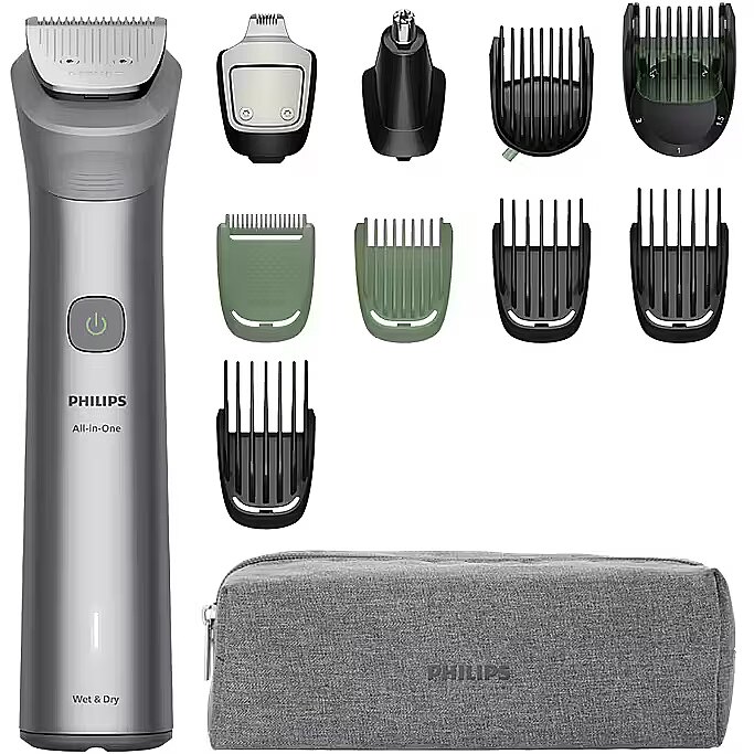 Technical details > Accessories included - Comb 3 - 10 mm; Comb 11 - 21 mm; Fixed combs with 1 mm & 2 mm; Body groomer; Ear & nose trimmer; Detail trimmer; Mini foil shaver; Gillette Fusion5 ProGlide razor; Charging stand; Cleaning brush; SmartPlug; Soft pouch