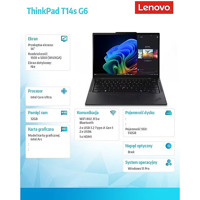 LongDesc - UNLEASH YOUR CREATIVITYPowerful AI PerformanceBoost your productivity on the 14″ Lenovo ThinkPad T14s Gen 6 laptop, driven by Intel® Core™ Ultra processor. With Intel® Arc™ graphics, create and design with pixel-perfect clarity. Plus, AI-enabled features like background blur, voice focus, and automatic framing improve your video presence for better engagements.ADVANCED-LEVEL SECURITYPeace of Mind With Smarter SecurityThe ThinkPad T14s Gen 6 laptop boasts ThinkShield, our comprehensive security suite. Features include biometric authentication with a fingerprint reader and zero-touch facial login with the infrared camera. Discrete Trusted Platform Module ensures data encryption and for added protection, there’s a webcam privacy shutter.A PC THAT WORKS FOR YOUAmplify Productivity With a Copilot+ PCCopilot+ integrates advanced AI capabilities to improve task management through real-time suggestions, automation of routine processes, and personalized insights. It learns your preferences and seamlessly supports everything from creating documents to drafting communications. Plus, with the touch of a key, Copilot launches to help keep you ahead in fast-paced work environments.CREDIBILITY & COLLABORATIONSustainabilityOur goal is to provide smarter technology that builds a brighter, more sustainable future for our customers, communities, and the planet. That's why we pursue industry leading labels and certifications that demonstrate our commitment to sustainability in product design. Together, we can build a smarter future for all.Specifications may vary depending upon region / model.