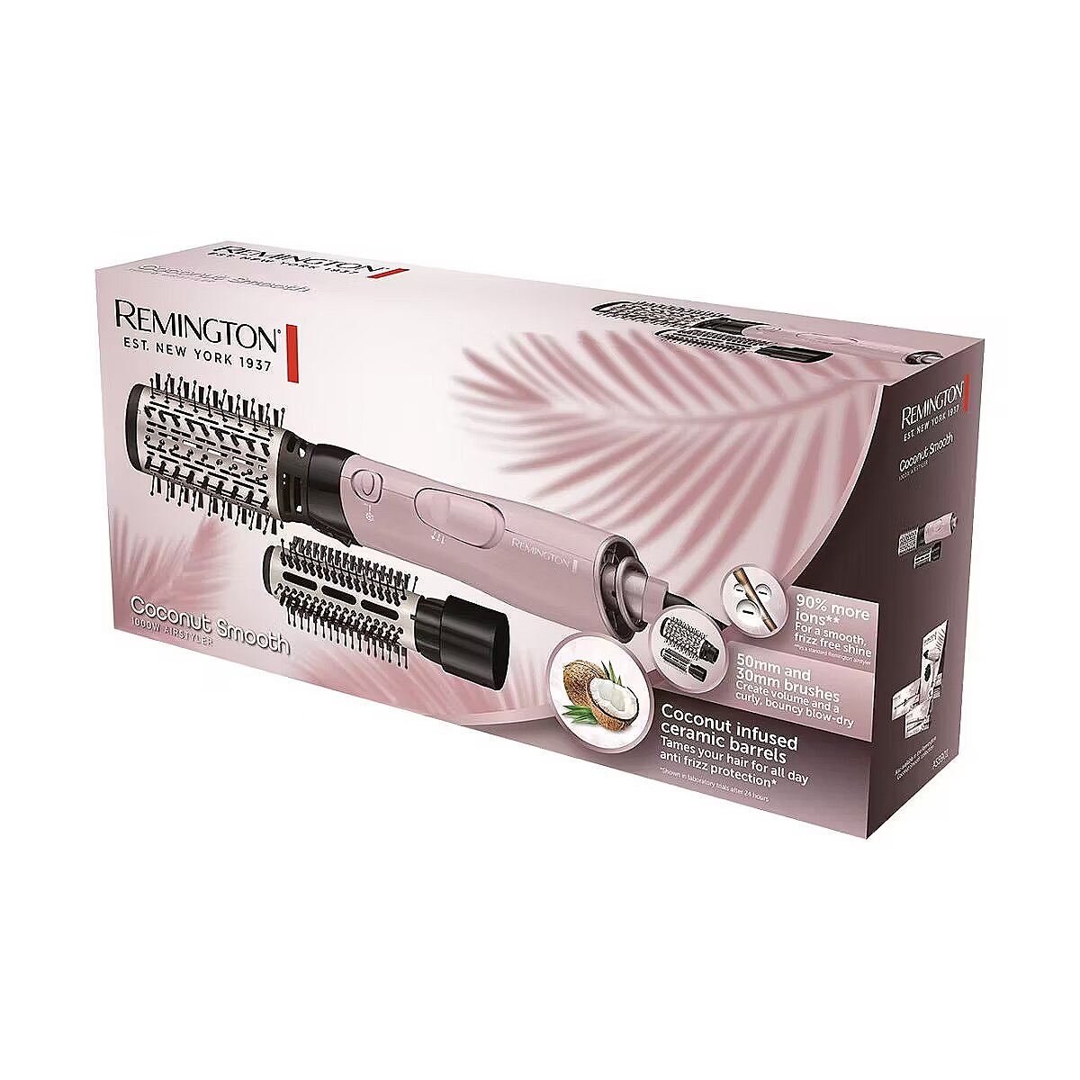 Description - Coconut Smooth AS5901 dryer and curler Increase volume, add carefree bounce or achieve smooth, shiny hair with the Remington Coconut Smooth Hot Air Styler. Regardless of what you want to look like today, we will help you. Two brushes with mixed bristles take care of styling, while ceramic heaters with coconut microparticles and ionic nourishment tame unbearable static electricity, so you can enjoy the perfect effect every time. Advanced ceramic heaters with micro-particles of coconut conditioner will help tame your hair and provide all-day protection against static electricity. The microparticles of the conditioner are transferred to the hair during styling, resulting in a smooth and soft hairstyle. Ionic Conditioning - 90% more ions help fight frizz while drying, helping to achieve beautifully smooth results and enhancing shine. It dries and styles effortlessly thanks to the power of 1000W, so you can quickly achieve perfect results. Because the device dries and styles at the same time, you don't need to use a second styler, which helps protect your hair from excessive heat. The 30 mm round brush is perfect for creating tight curls and adding a dynamic effect. The 50 mm round brush is perfect for creating bouncy, voluminous curls. Whether you have thick or thin hair, the blended bristles gently glide from root to tip and are perfect for controlled shaping and styling. 2 temperature/speed settings allow you to control the heat level and speed, giving you complete control over your hair styling. Use the cold blast function to give your hair a blast of cool air when it is almost dry. This cold blast will help fix the hairstyle and close the hair coatings, giving them shine. The removable, easy-to-clean grill is designed to protect the device from dust and hair. Simply remove the grille, clean or dust it with a dry cloth and put it back on. You won't be limited when using the styler because the swivel cord allows you to use it at various angles, which helps you reach parts of your hair that are sometimes missed. The cord will not tangle during use.
