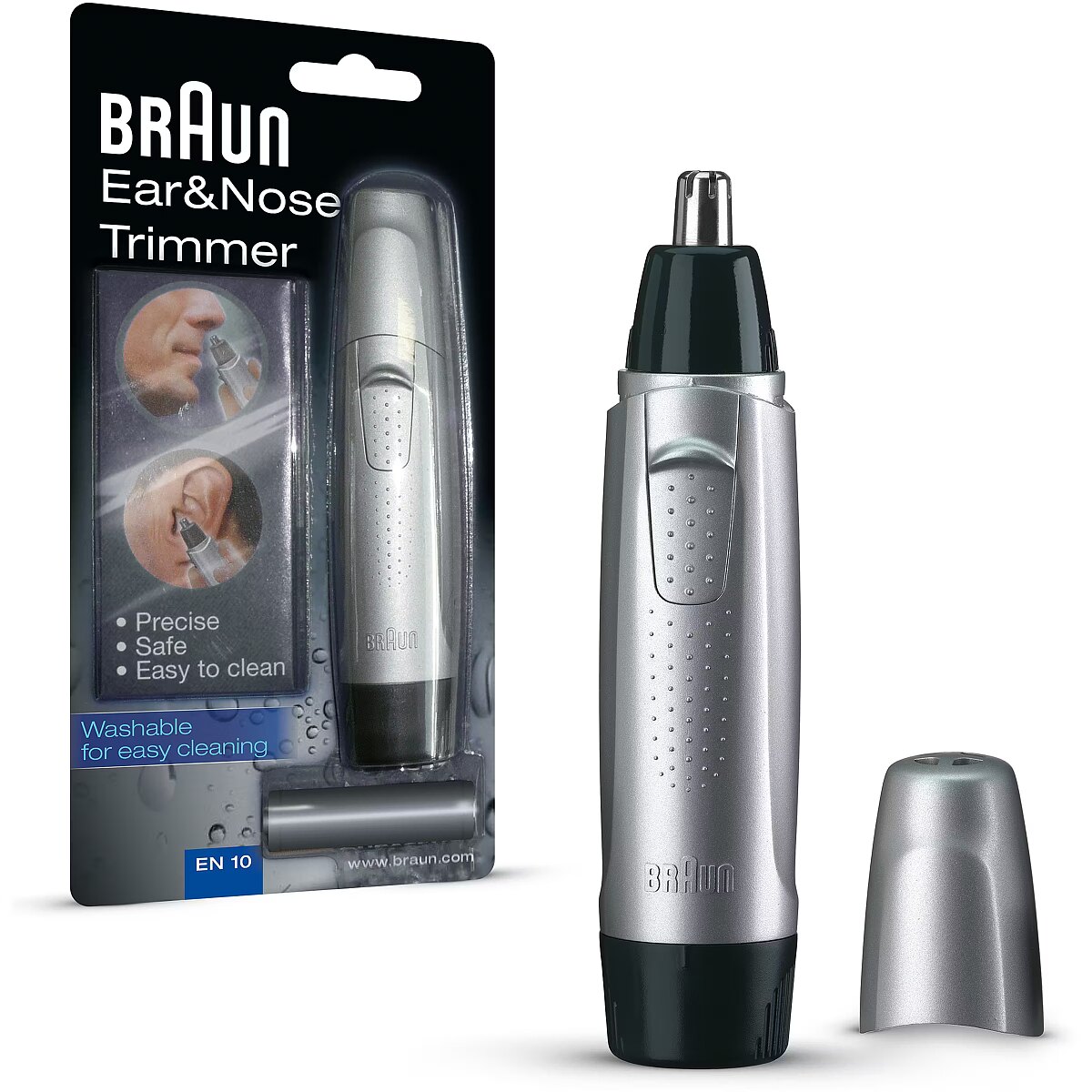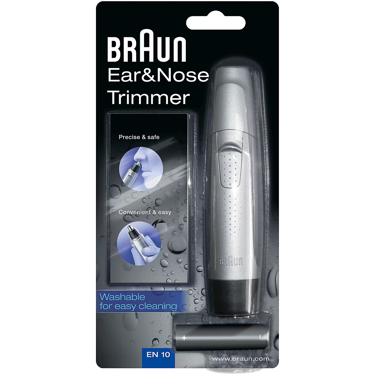 LongSummaryDescription - Braun Ear&Nose EN10. Precision trimmer purpose: Ear, Nose. Product colour: Black, Grey, Blade material: Stainless steel. Power source: Battery, Battery type: AA, Battery technology: Alkaline. Weight: 100 g. Package width: 32 mm, Package depth: 100 mm, Package height: 200 mm