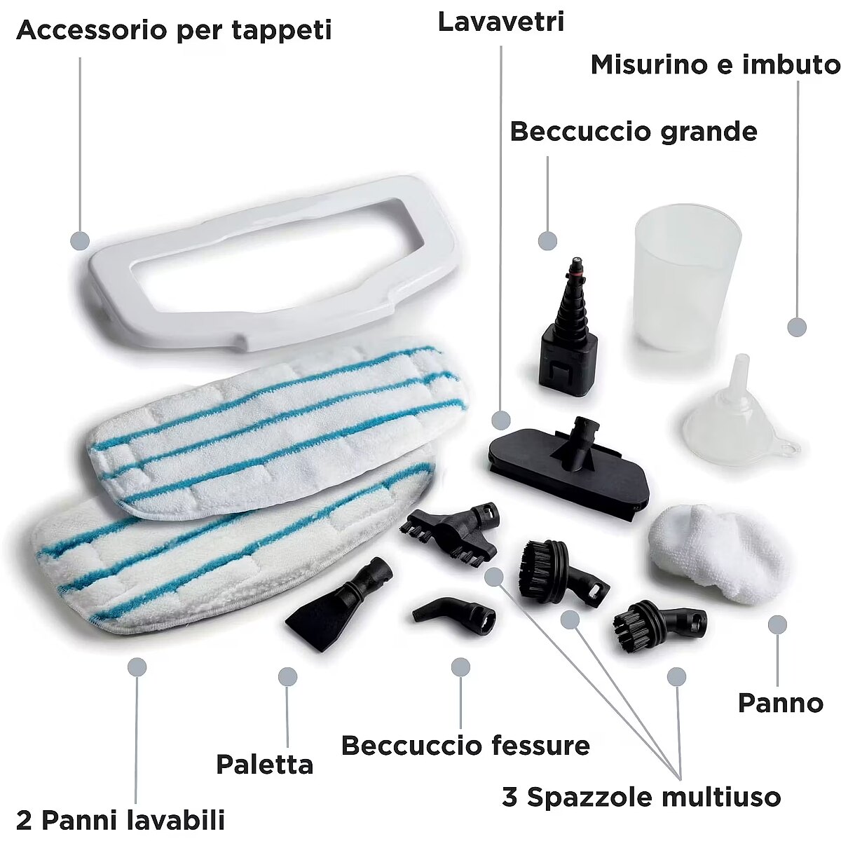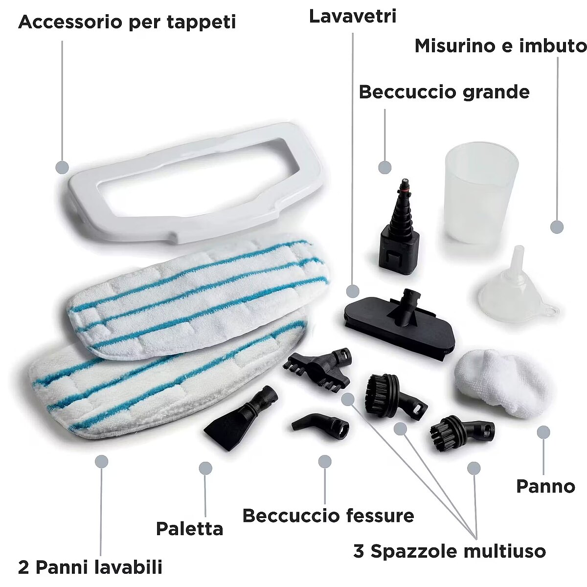 Accessories : Floor scraper, Microfiber Peeler, Rectangular brush, Round brush, Scraping brush, Tip for slots, Window cleaning tip