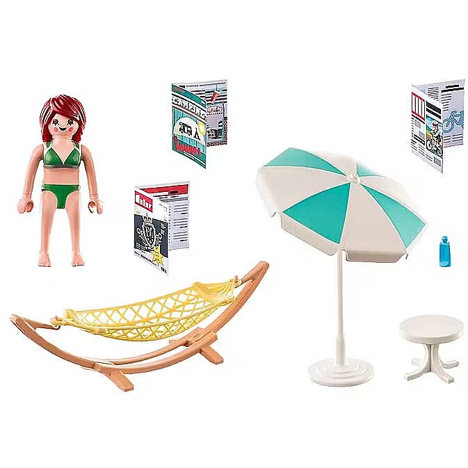 Accessories included - Figure: 1 woman; Accessories: 1 table, 2 magazines, 1 umbrella, 1 can, 1 hammock