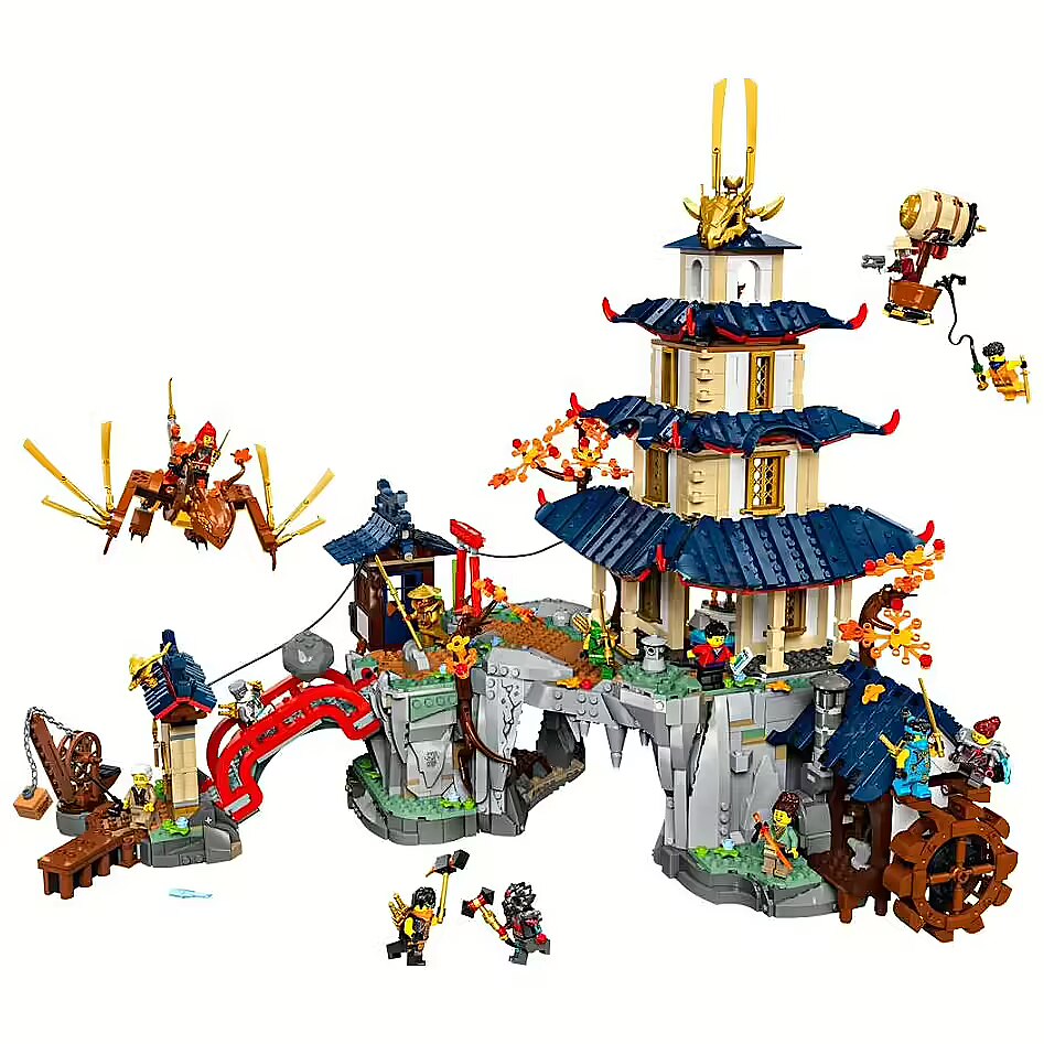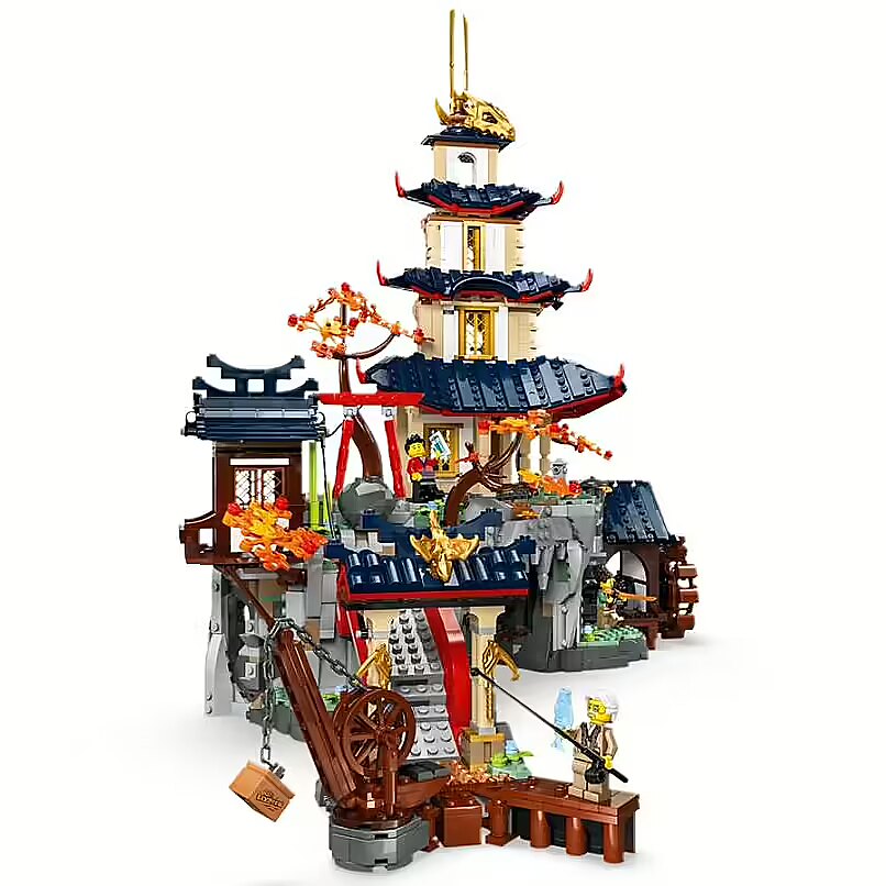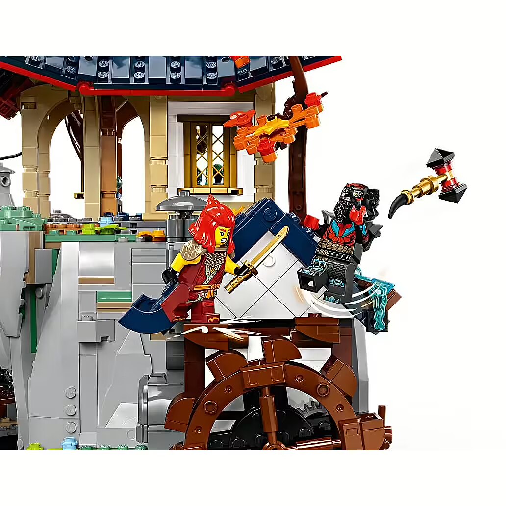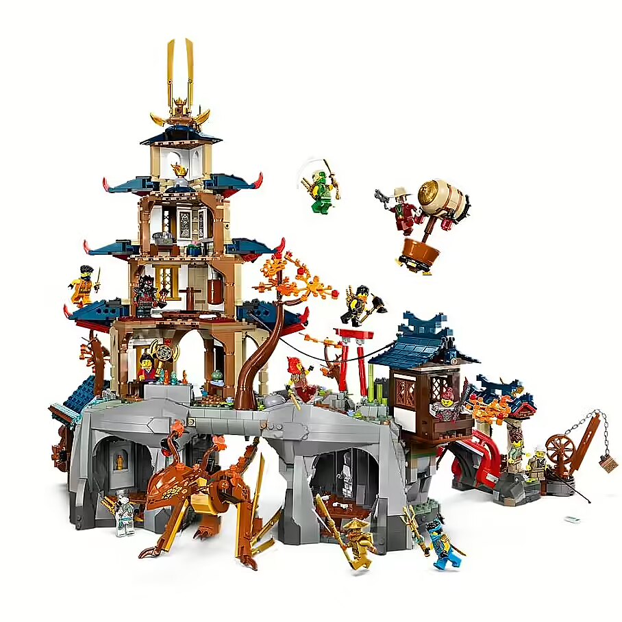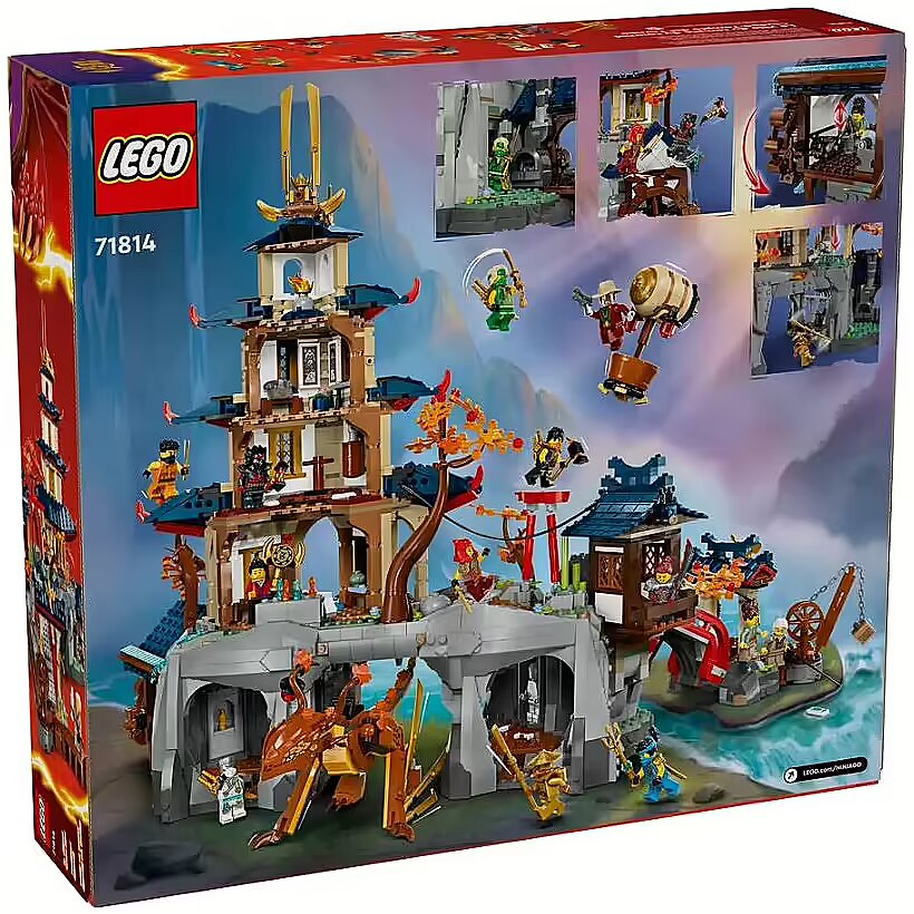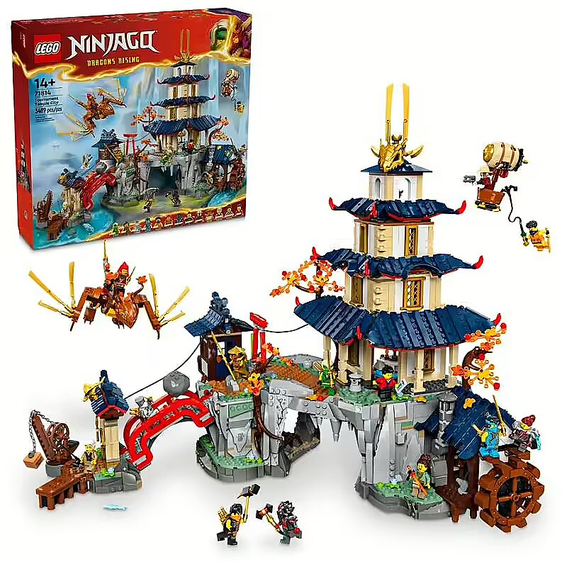 Description - Boys and girls aged 14+ can build, play with and proudly display the Tournament Temple City (71814) adventure toy set from season 2 of the NINJAGO Dragons Rising TV show. This spectacular and detailed fantasy toy battle set for kids makes an impressive display model and contains lots of interactive features and functions for hours of action-packed playtime. The NINJAGO temple built into a rock face features a 4-tiered pagoda, a bridge, a water mill kids can turn to move 2 battle platforms and a blacksmiths hammer, plus falling rocks that are activated by pressing a lantern, hidden storage and a secret door. Kids can turn the temple around, where its open back provides extra play options and the chance to create fun little stories. This buildable ninja toy for kids comes with 13 NINJAGO minifigures: Lloyd, Cole, Nya, Zane, Arin, Wyldfyre, Lord Ras, Jordana, Mr. Pale, Blacksmith, a Temple Guard, Roby and Bleckt. There is also an airship and a posable dragon toy with blade-style wings. NINJAGO  temple adventure toy for kids Boys and girls aged 14+ can build, play with and proudly display this Tournament Temple City building set from season 2 of the NINJAGO Dragons Rising TV show Playable ninja display model Includes a water mill that can be turned to move 2 battle platforms, a blacksmiths hammer and falling rocks that are activated by pressing a lantern Posable dragon toy and airship This action toy for kids also includes a posable dragon toy and an airship for theNINJAGO minifigure characters to travel in 13 NINJAGO minifigures This ninja toy for kids comes with Lloyd, Cole, Nya, Zane, Arin, Wyldfyre, Lord Ras, Jordana, Mr. Pale, Blacksmith, a Temple Guard, Roby and Bleckt for role play LEGO NINJAGO gift for play and display This ninja LEGO set for kids provides a fun build-and-play experience and is a birthday gift idea for boys and girls aged 14 and up A helping hand Discover intuitive instructions in the LEGO Builder app, where builderscan zoom in and rotate models in 3D, track their progress and save sets as they develop new skills Bigger ninja adventures Look out for more LEGO NINJAGO toys (sets sold separately) featuring dragons, mechs and vehicles Measurements This big LEGO set has 3,489 pieces and includes Temple Island measuring over 19 in. (48 cm) high, 25 in. (63 cm) wide and 12.5 in. (32 cm) deep