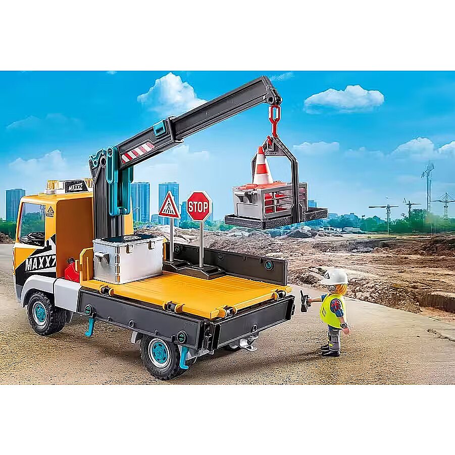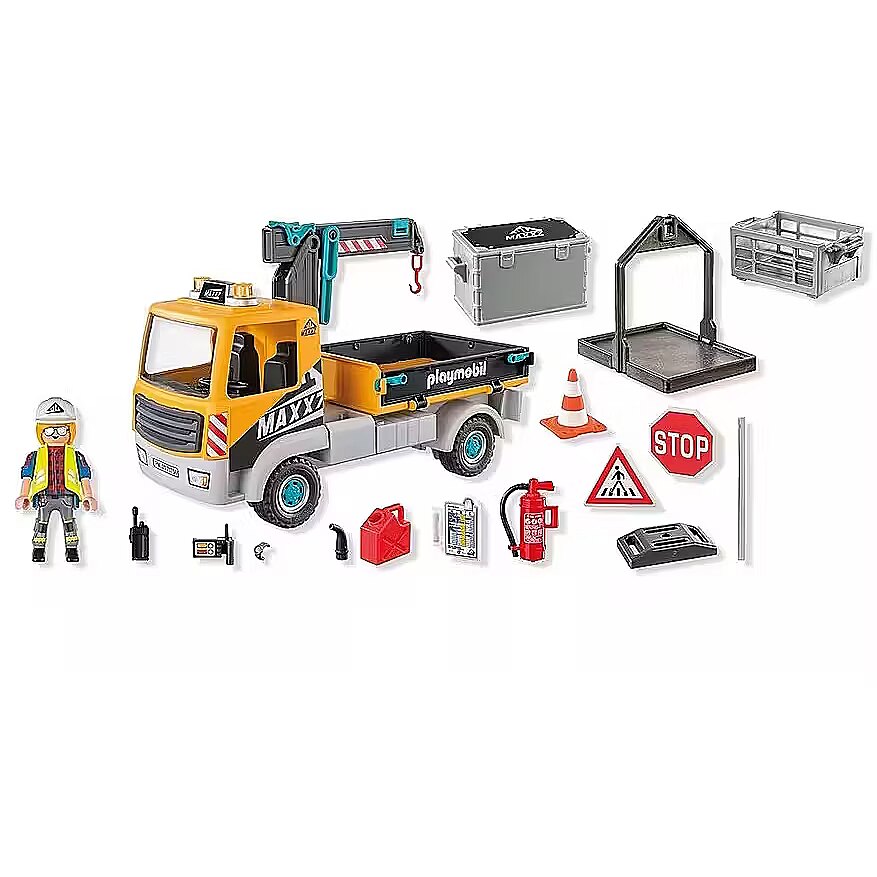 Accessories included - Figurki: mężczyzna z kaskiem budowlanym Akcesoria: ciężarówka budowlana ze zdejmowanym dachem oraz wysuwanym i obracanym dźwigiem transportowym, skrzynia transportowa do dźwigu, sprzęt budowlany, kanister z olejem, pachołek drogowy, kamizelka ochronna, notatnik, kamera