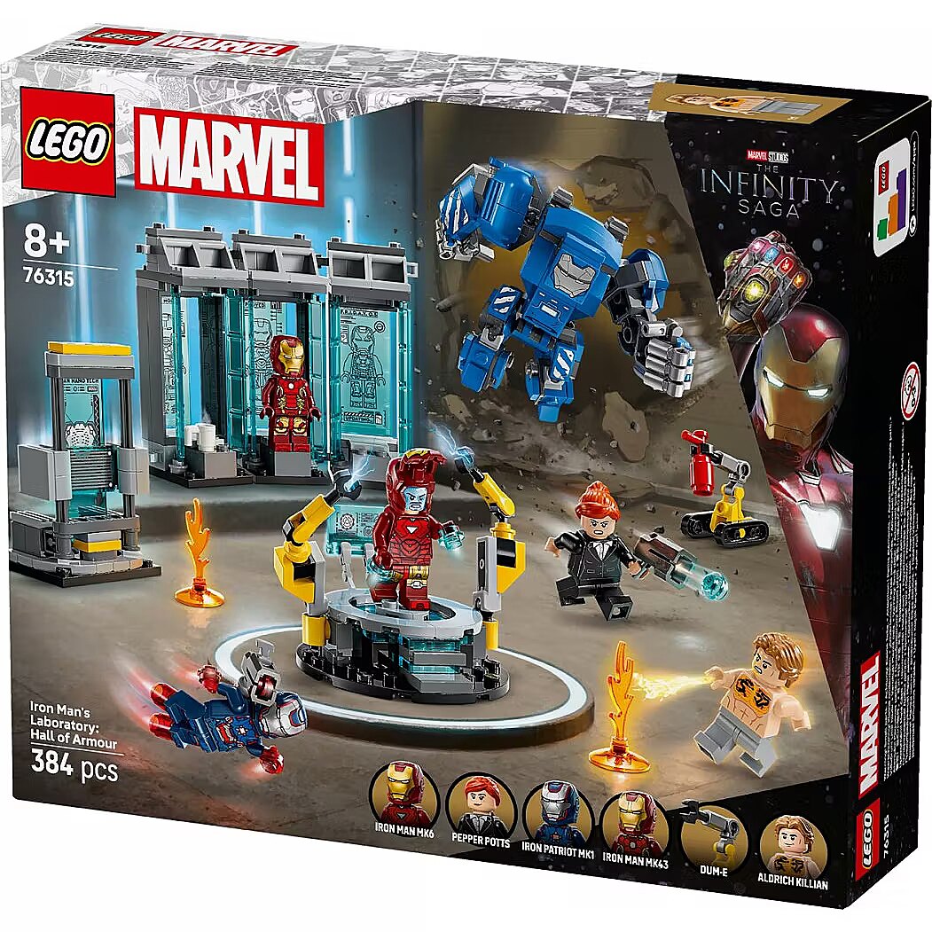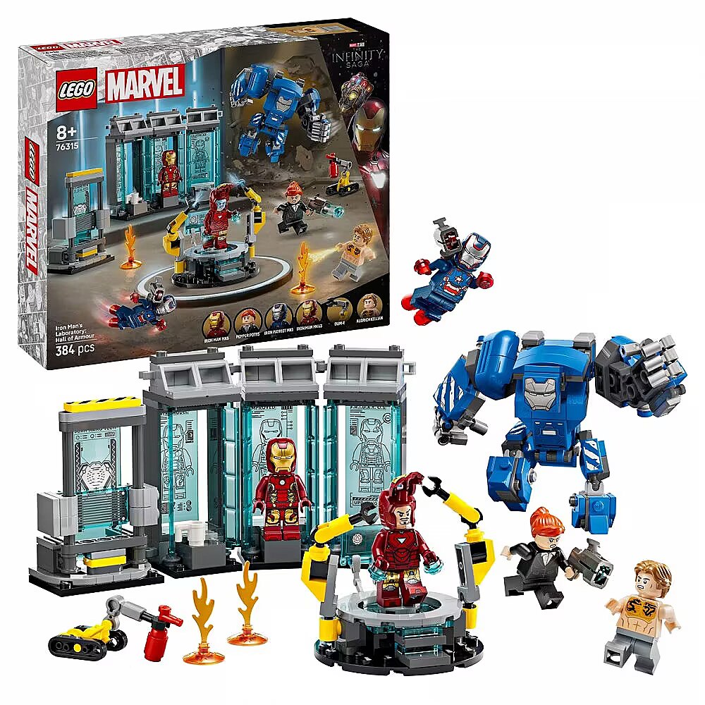 Description - The Iron Mans Laboratory: Hall of Armor (76315) building set takes young Super Heroes and fans of Marvel Avengers movies into Iron Mans iconic lab. Packed with LEGO Marvel figures and cool features to inspire imaginative adventures, this kids build-play-and-display set is an ideal gift for boys and girls aged 8 and up. The buildable LEGO Marvel toy features 3 armor pods and 3 Iron Man armor minifigures: the Iron Patriot, MK43 and MK6. The lineup is completed by Pepper Potts and the villain Aldrich Killian minifigures, a buildable Dum-E robot and a large, Igor Iron Man MK3 mech with movable arms and legs and a cockpit with room for a minifigure. Other features include a maintenance platform with 2 robotic-style arms and a large scanning device. Theres also a fire extinguisher and 2 fire elements and 2 stud shooters for when the battle action begins. For added digital fun, builders can zoom in, rotate models in 3D and track their progress using the fun, intuitive LEGO Builder app. Set contains 384 pieces. Iron Mans lab with LEGO Marvel figures Iron Mans Laboratory: Hall of Armor is a kids build-play-and-display Avengers set for boys and girls aged 8 and up Super Hero characters Iron Patriot, MK43 and MK6 Iron Man armor, Pepper Potts and Aldrich Killian minifigures, a buildable Dum-E robot and an MK3 mech with movable arms and legs and an opening cockpit Iron Man action and adventure The lab features 3 armor pods, a maintenance platform with 2 robotic-style arms and a large scanning device and 2 stud shooters for when the battle action begins Fun accessories Authentic details, like a fire extinguisher and 2 fire elements add to the imaginative play possibilities Iron Man gift for kids This versatile LEGO building set is a great gift idea for boys and girls who are fans of Super Hero adventures and Marvel movies 3D building instructions Kids can download the LEGO  Builder app for an immersive building experience, with digital tools to zoom in and rotate models in 3D, save sets and track progress Buildable toys for young Super Heroes The extensive range of LEGO Marvel building sets gives kids an ever-changing universe of build-and-play Super Hero adventures 384-pieces The 3 Iron Man armor pods measure over3.5 in. (9 cm) high, 4.5 in. (11 cm) wide and 1.5 in. (5 cm) deep