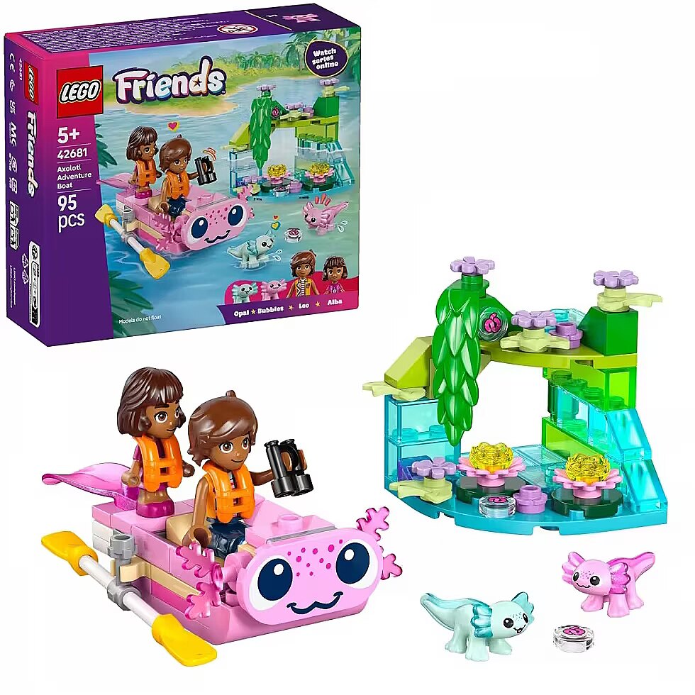 Description - Blocks Friends 42681 Axolotl Adventure Boat Inspire girls and boys aged five and up to tell cool stories with the LEGO Friends Axolotl Boat Adventure (42681). This set includes a mini-doll figure, a micro-doll figure, two small axolotls, and accessories that encourage creative play.