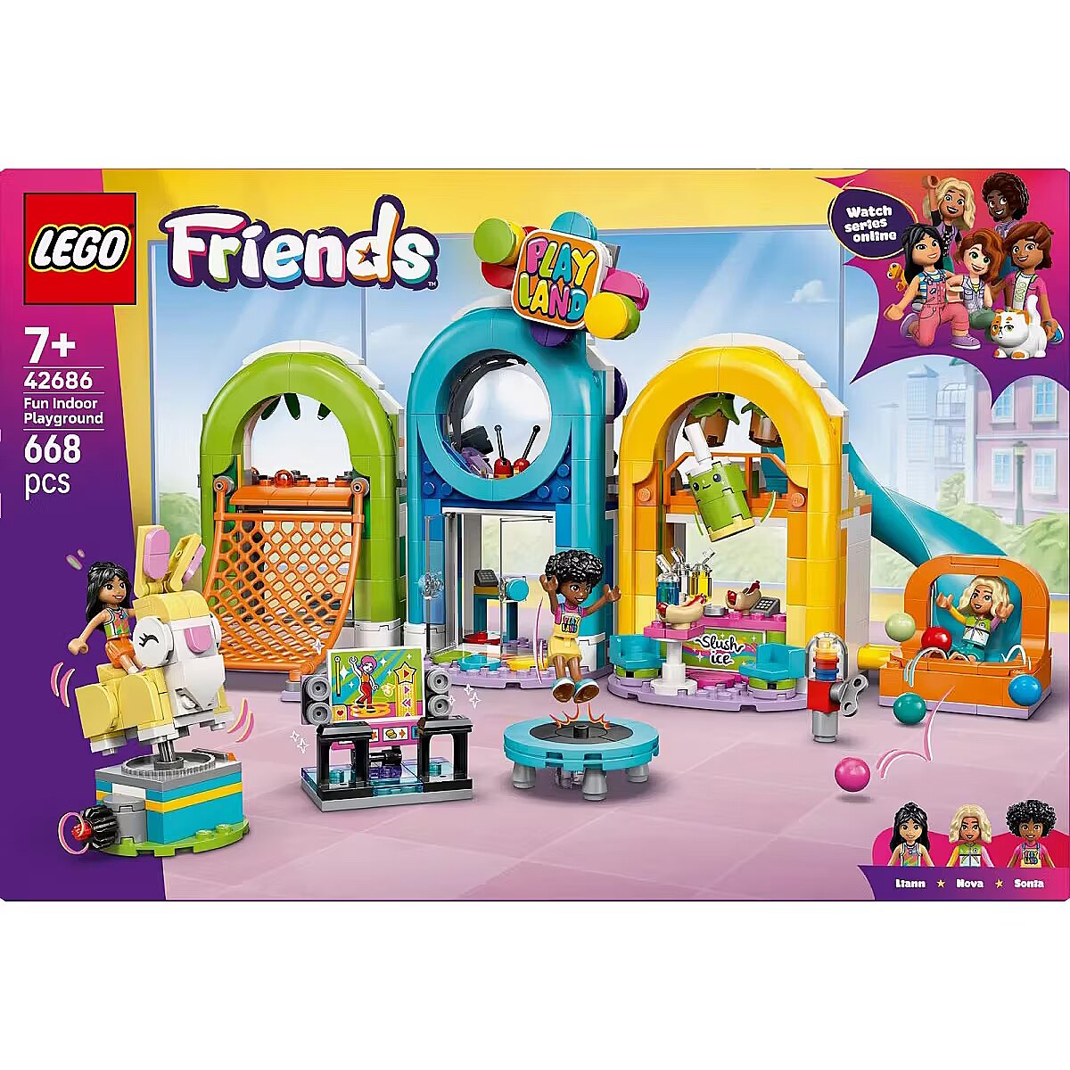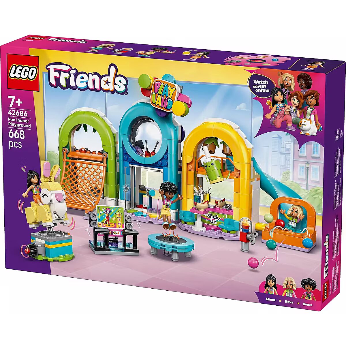 Description - Blocks Friends 42686 Fun Indoor Playground Let children aged seven and up unleash their imagination as they explore the LEGO Friends Amazing Playroom (42686). This fun-packed set includes three mini-dolls and loads of accessories, as well as obstacles, challenges, and attractions that guarantee great fun. Kids wont want to leave this playground, spending hours enjoying open-ended role play and inventing adventures for the characters. At every turn, theyll find cool features, including a climbing net, obstacles, a carousel, a ball pit, a slide, a bunny-themed attraction, and a snack bar. The fun never ends, and accessories such as a dance machine, trampoline, hot dogs, sorbets, a gumball machine, and cash registers spark childrens creativity even more. This set makes a great gift for girls and boys who love role-play and using their imagination to create stories with toys. The LEGO Builder app guides kids through an intuitive building experience. They can zoom in and rotate sets using 3D instructions, save their sets, and track their building progress. The set consists of 668 pieces.