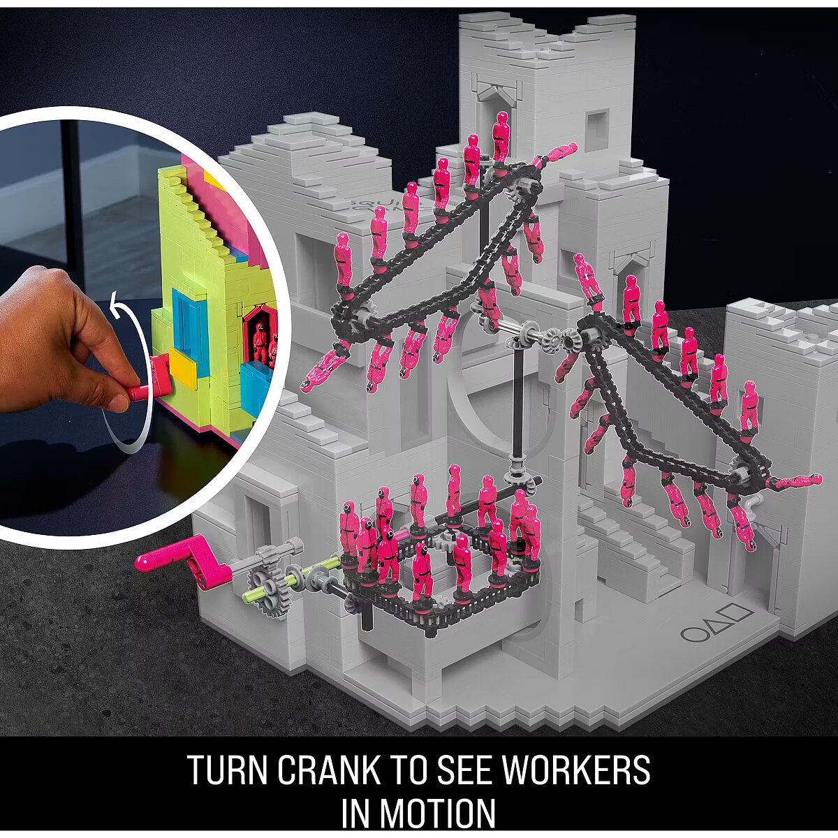 LongDesc - Everyone is equal while they play this game. The hit show Squid Game comes to life with a collector building set by MEGA. Built for display, this set recreates the iconic scene on the staircase, including the bright colours, pink-suited workers, and the omnipresent Front Man. Turn the crank on the side to see the workers march up the stairs.