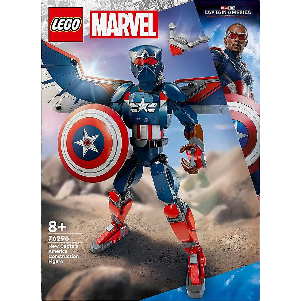 Description - Put Marvel movie action into the hands of young Super Heroes with the authentically detailed, fully jointed LEGO Marvel New Captain America Construction Figure (76296) for kids aged 8 and over. For this incarnation of the Marvel super soldier, the winged Falcon takes on the role of Captain America, bringing an extra dimension to kids play experience. The buildable Super Hero toy stands over 28 cm (11 in.) tall and has movable shoulder, arm, hip and leg joints, which enable realistic action poses as kids immerse themselves in imaginative role play. Large foil wings are attached to the figures back. The wings can be bent to mimic flapping and remove easily when the action moves back to the ground. The Captain America figure carries his iconic shield and has a buildable Redwing drone toy fixed to his back, which kids can easily detach for independent play. For added digital fun, builders can zoom in, rotate sets in 3D and track their progress using the fun, intuitive LEGO Builder app. Captain America buildable toy for kids LEGOMarvel New Captain America Construction Figure puts Super Hero action into the hands of boys and girls aged 8 and over Posable figure Captain Americas movable shoulder, arm, hip and leg joints enable realistic action poses as kids take the action hero on endless imaginative adventures Authentic accessories The Captain America figure carries his iconic shield and has a buildable Redwing drone toy fixed to his back, which kids can detach for independent role play. Trendy Super Hero gift For this incarnation of the Marvel super soldier, the winged Falcon figure takes on the role of Captain America, bringing an extra dimension to the play action Gift for Marvel film lovers Give this buildable Super Hero toy to fans of Avengers action from the Marvel Universe 3D building instructions Kids can download the LEGO Builder app for an immersive building experience, with digital tools to zoom in and rotate models in 3D, save sets and track progress Expand the Super Hero fun There are more LEGO Marvel construction figures in the series to collect, sets sold separately LEGO Marvel Avengers action for kids The 359-piece Captain America figure stands over 28 cm (11 in.) tall: big enough for epic action, small enough for kids to take wherever they go