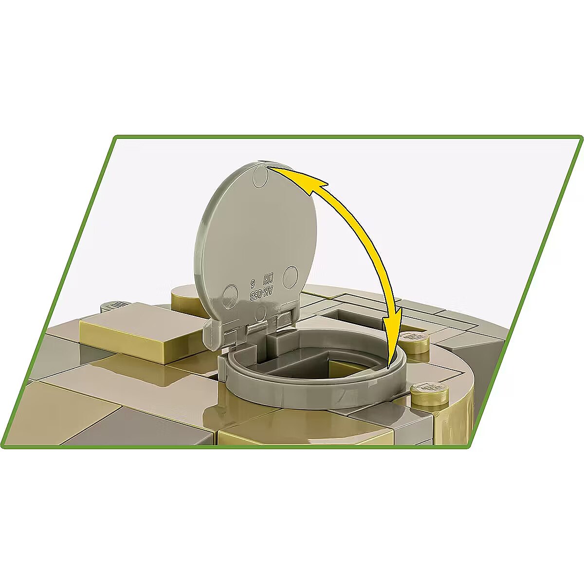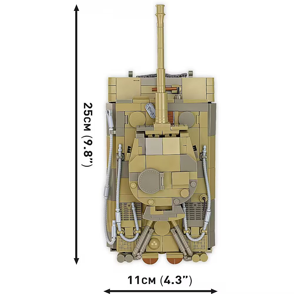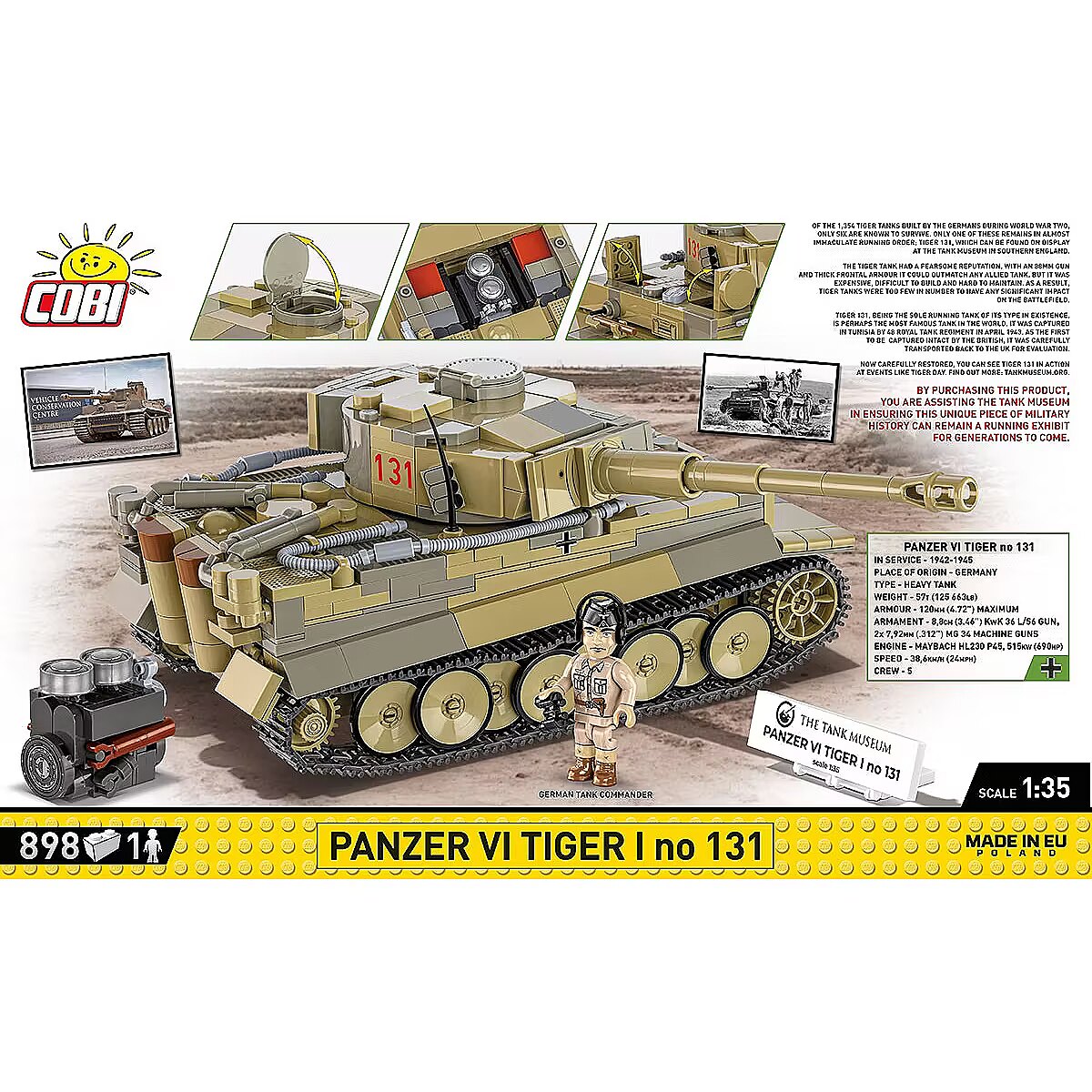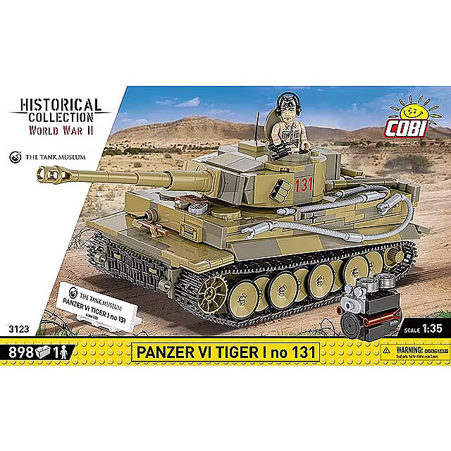 Description - Panzer VI Tiger I no 131 Wyjątkowy model bardzo rozpoznawalnego i utrzymywanego wciąż na chodzie czołgu. PzKpfw VI Tiger z numerem 131. Słynny Tiger został przejęty przez Brytyjczyków w Afryce podczas II wojny światowej i obecnie jest największą atrakcją The Tank Museum! Klockowy Tygrys 131 został odwzorowany z dbałością o szczegóły w bardzo popularnej skali 1:35! Warto podkreślić, że jest to pierwszy raz, gdy COBI wypuszcza legendarnego Tygrysa w tym rozmiarze! Model posiada ruchome elementy takie jak: wieża i lufa działa oraz obracające się koła i gąsienice. Dopracowany zestaw składa się z 898 elementów i wiernie odzwierciedla oryginalne kształty swego historycznego pierwowzoru. Nasz potężny klockowy czołg został pokryty wysokiej jakości nadrukami, które się nie ścierają. Na szczególną uwagę zasługuje bliska oryginałowi kolorystyka, która sprawia, że model wygląda olśniewająco! W zestawie znajduje się mini model silnika Maybach, który można wyeksponować obok modelu lub umieścić w czołgu pod klapą serwisową. Model posiada ruchome koła i gąsienice składające się z wielu ogniw. W trakcie zabawy można jeździć czołgiem i obserwować pracującą trakcję gąsienicową! Włazy są otwierane i pod nimi znajduje się miejsce dla standardowych figurek COBI. Fgurka przedstawia dowódcę czołgu w tropikalnym umundurowaniu. Całość zestawu uzupełnia biała tabliczka z nadrukowaną nazwą czołgu oraz logotypem The Tank Museum! Buduj historię, klocek po klocku i uzupełnij swoją kolekcję!