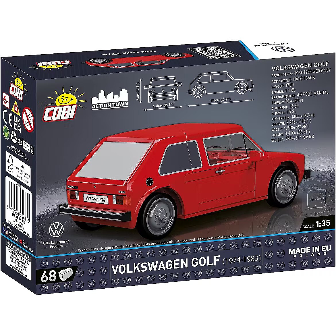 Prosta instrukcja sprawia, że składanie modelu jest intuicyjne, a dzięki wysokiej jakości elementom łączenie klocków jest czystą przyjemnością. Po zakończeniu budowy VOLKSWAGEN Golf stanie się wspaniałym egzemplarzem, który uzupełni Twoją kolekcję kultowych aut od COBI. A jeśli chcesz poczuć moc tego auta, zabierz model na zawody z przyjaciółmi! Zestaw VOLKSWAGEN GOLF (1974-1983) to doskonała propozycja zarówno dla młodszych, jak i starszych fanów budowania z klocków oraz miłośników motoryzacji, którzy szukają czegoś wyjątkowego do swojej kolekcji. 68 wysokiej jakości elementy Wyprodukowane w UE przez firmę z ponad 35-letnią tradycją Spełniają normy bezpieczeństwa dotyczące produktów dla dzieci W pełni kompatybilne z innymi markami klocków konstrukcyjnych Czytelna i intuicyjna instrukcja oparta na rysunkach i ikonach