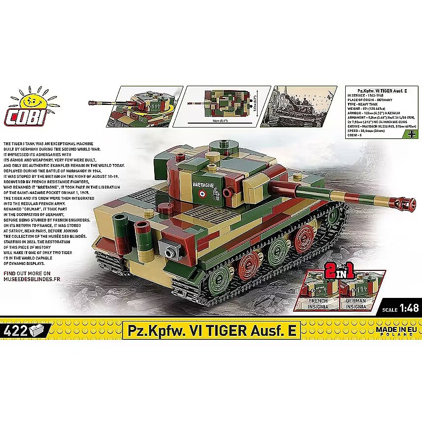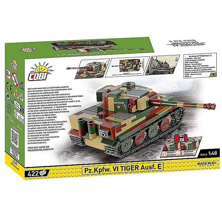 Description - Ten precyzyjnie odwzorowany model to prawdziwa gratka dla kolekcjonerów poszukujących wyjątkowego, historycznego eksponatu o najwyższej jakości wykonania. Teraz masz okazję odtworzyć ten legendarny pojazd w formie starannie zaprojektowanego modelu w nowej skali 1:48, która łączy realistyczny wygląd z funkcjonalnością. Model ten to idealna propozycja zarówno dla kolekcjonerów, jak i miłośników historii, którzy cenią sobie dokładność oraz satysfakcję z tworzenia. Oferuje możliwość wyboru wersji historycznej niemieckiej lub francuskiej co nadaje mu unikalny charakter! Tiger I, znany również jako Panzerkampfwagen VI, był jednym z najgroźniejszych czołgów II wojny światowej. Jego potężne działo kal. 88 mm oraz gruby pancerz sprawiały, że dominował na polach bitew od 1942 roku. Prezentowany model przedstawia egzemplarz o numerze bocznym 114, który po przejęciu przez aliantów został wcielony do armii francuskiej, gdzie otrzymał nazwę Bretagne. Po wojnie trafił do muzeum w Saumur, gdzie do dziś przyciąga uwagę jako jeden z nielicznych sprawnych czołgów Tiger na świecie. Zalety zestawu Pz.Kpfw. VI TIGER Ausf. E 2in1: Skala 1:48 - Nowa skala modelu to idealne połączenie detalu i kompaktowego rozmiaru. Doskonale sprawdza się zarówno jako model kolekcjonerski, jak i edukacyjna zabawka. 422 wysokiej jakości elementy - Zapewniają trwałość, stabilność i dużą satysfakcję z budowy. Każdy klocek został zaprojektowany z myślą o jak najwierniejszym odwzorowaniu oryginału. Współpraca z Musée des Blindés - Model powstał we współpracy z renomowanym francuskim muzeum czołgów, co gwarantuje historyczną wierność i autentyczność detali. Ruchome elementy i trakcja gąsienicowa - Ruchoma wieża i lufa pozwalają na realistyczne ustawienie czołgu w różnych pozycjach bojowych. Gąsienice poruszają się podczas przesuwania modelu, co dodaje mu realizmu i dynamicznego charakteru. Możliwość wyboru oznaczeń historycznych - W zestawie znajdują się elementy umożliwiające zbudowanie zarówno wersji niemieckiej, jak i francuskiej z nazwą własną Bretagne. Prosty proces budowy - Instrukcja dołączona do zestawu posiada ikony i ilustracje, które przeprowadzą Cię przez proces budowy krok po kroku. Dzięki temu składanie modelu jest łatwe i przyjemne, nawet dla osób bez doświadczenia w układaniu klocków konstrukcyjnych. Szeroki wybór - Sprawdź inne pojazdy z serii HISTORICAL COLLECTION: World War II i twórz własną kolekcję wspaniałych maszyn! Ten model to coś więcej niż zestaw klocków - to historia, którą możesz zbudować własnymi rękami. Niezależnie od tego, czy jesteś pasjonatem militariów, modelarzem, czy po prostu szukasz wyjątkowego projektu do stworzenia Tiger I nr 114 w skali 1:48 spełni Twoje oczekiwania. 422 wysokiej jakości elementy Wyprodukowane w UE przez firmę z ponad 35-letnią tradycją Produkt na oryginalnej licencji Musée des Blindés Spełniają normy bezpieczeństwa dotyczące produktów dla dzieci W pełni kompatybilne z innymi markami klocków konstrukcyjnych Czytelna i intuicyjna instrukcja oparta na rysunkach i ikonach Skala 1:48
