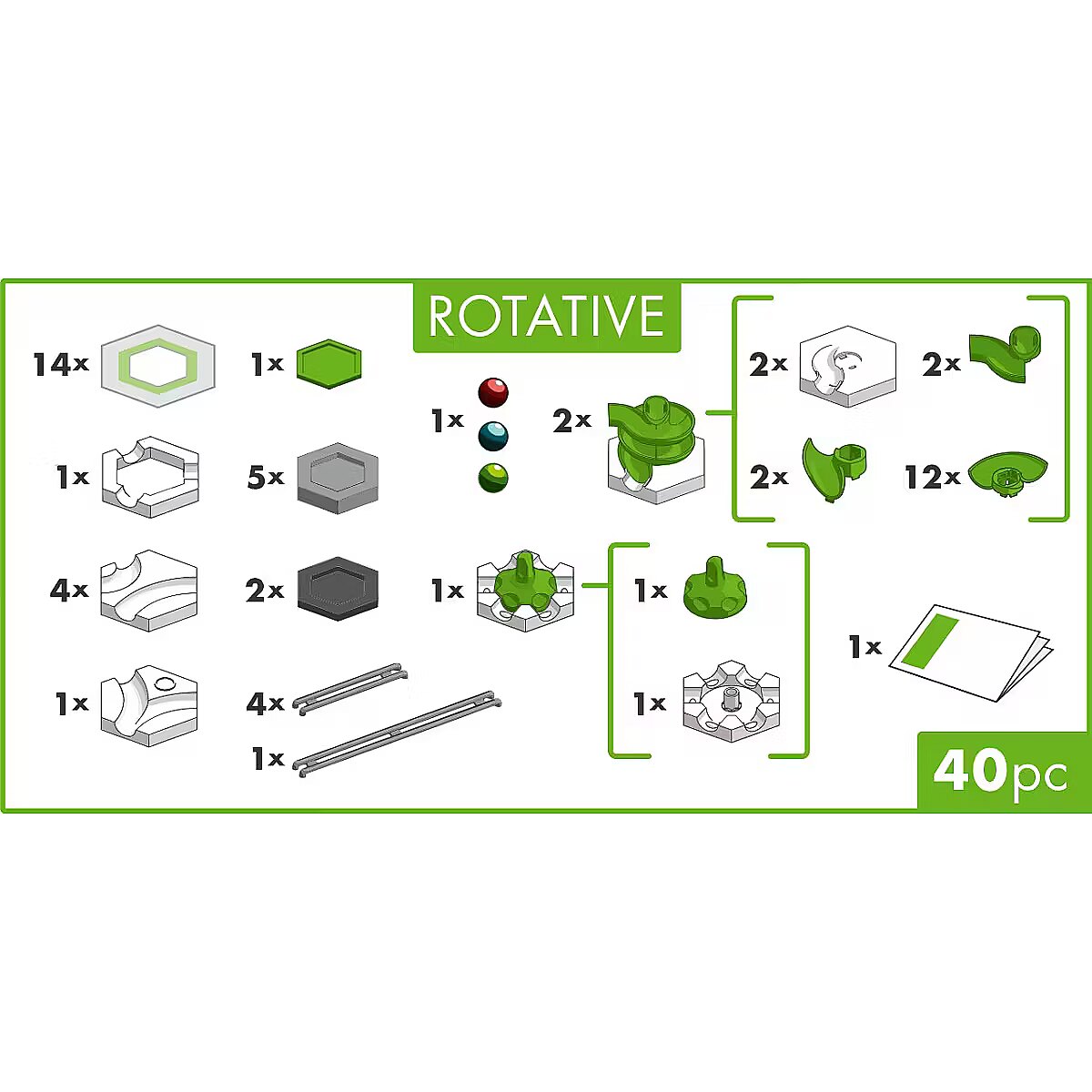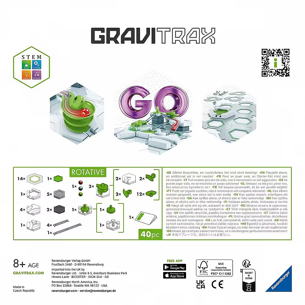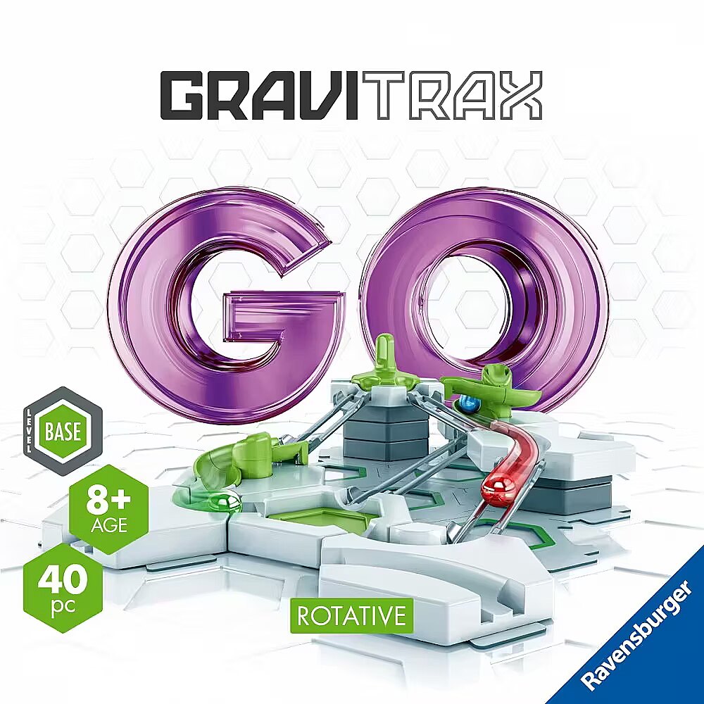 GraviTrax GO Rotative is a compact starter set, perfect for beginner builders. Inside youll find 37 pieces, including a dynamic spiral action element that delivers spectacular twists and turns! Easy start: everything you need to build your first track. Learning through play: boosts creativity and helps you understand the laws of physics in practice. 4 ready-made challenges: build by following the instructions or experiment on your own. Endless fun: the set is compatible with all GraviTrax 8+ product lines. With GraviTrax GO, youll discover the world of physics hands-on and create your own unique tracks. Start building today-only your imagination sets the limits! The collection includes two set variants: GraviTrax GO Flexible and GraviTrax GO Rotative, each featuring a different action element that enables bold marble acrobatics. GraviTrax GO sets can be combined with all GraviTrax 8+ product lines, ensuring endless fun!