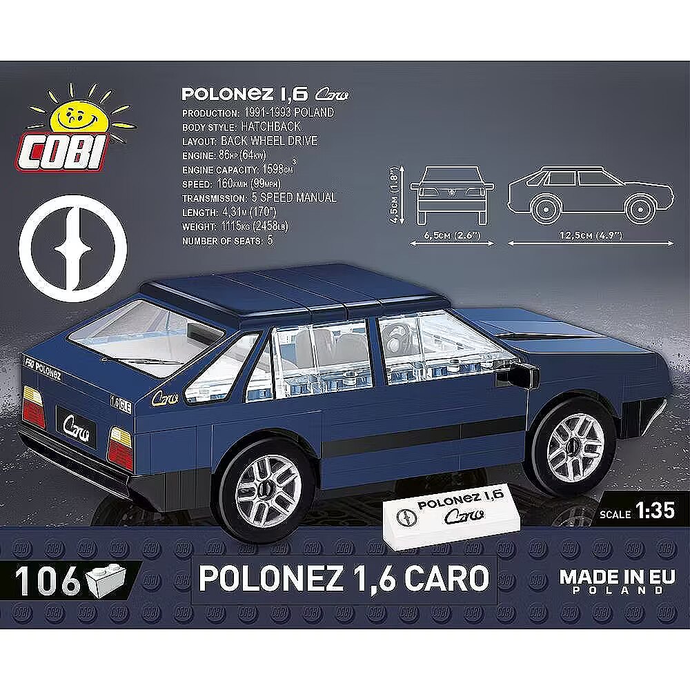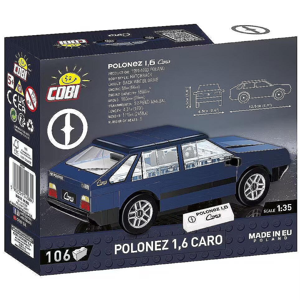 Description - The Polonez 1.6 Caro was considered by many automotive experts to be an exceptionally successful model. It complied with European ECE standards, and was produced in Poland between 1991 and 1997. The exclusive Caro became part of the Polish motoring landscape for many years! Now it is back in the form of a building block model from COBI! Published under the FSO licence on a scale of 1:35, it is a perfect addition to a collection of youngtimers. It is built entirely of construction bricks, which allows it to be rebuilt and modified. The bricks contain high-quality prints that will not wear off even during intensive use. The set is sure to be enjoyed by children, car enthusiasts and collectors alike. 106 high-quality pieces Manufactured in the EU by a company with over 20 years of tradition Comply with safety standards for children's products Fully compatible with other building block brands Printed bricks will not deform or fade during play or when exposed to temperature Clear and intuitive instructions based on drawings and icons Brick with printed model and car name