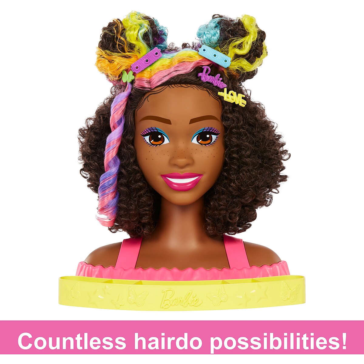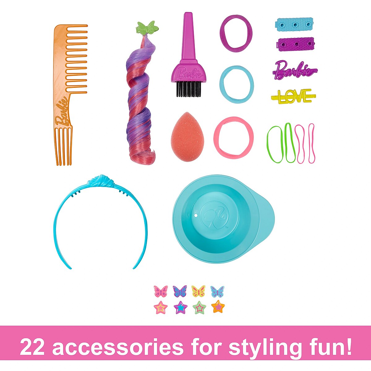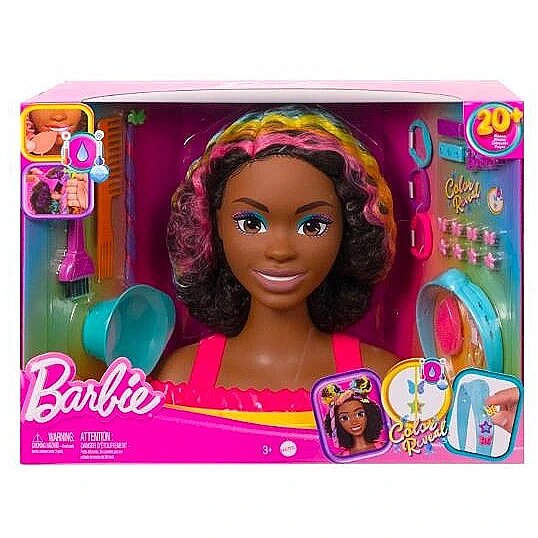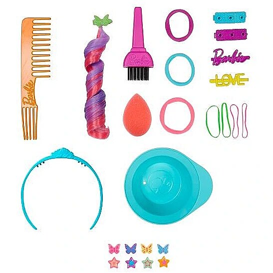 Packaging content - Packaging content - Includes 1 Barbie doll styling head with storage base, 1 hair pick, 1 hair dye brush, 1 hair dye bowl, 1 makeup sponge, 4 customizable barrettes, 8 Colour Reveal plug-ins, 1 colour-change hair extension, 1 customizable headband and 6 hair ties. Other dolls and playsets sold separately, subject to availability.