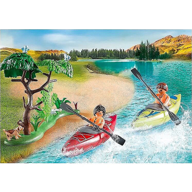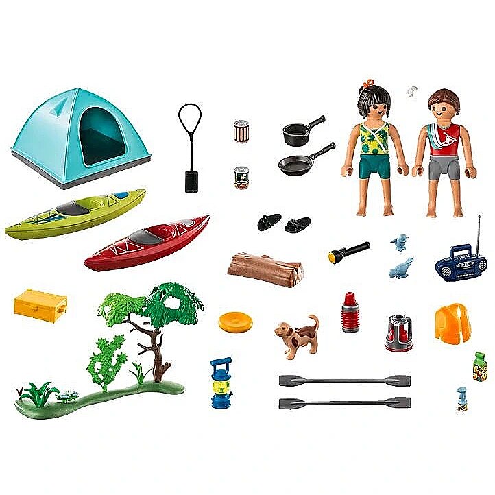 Accessories included - Figures: 1 man, 1 woman; Animals: 1 bird; Accessories: 1 tree stump, 1 lamp, 1 disc, 1 stove, 1 pot, 1 radio, 1 can, 1 can of sausages, 1 box, 1 pan, 1 tree, 1 bottle, 1 tent, 2 canoes, 2 paddles, 1 backpack