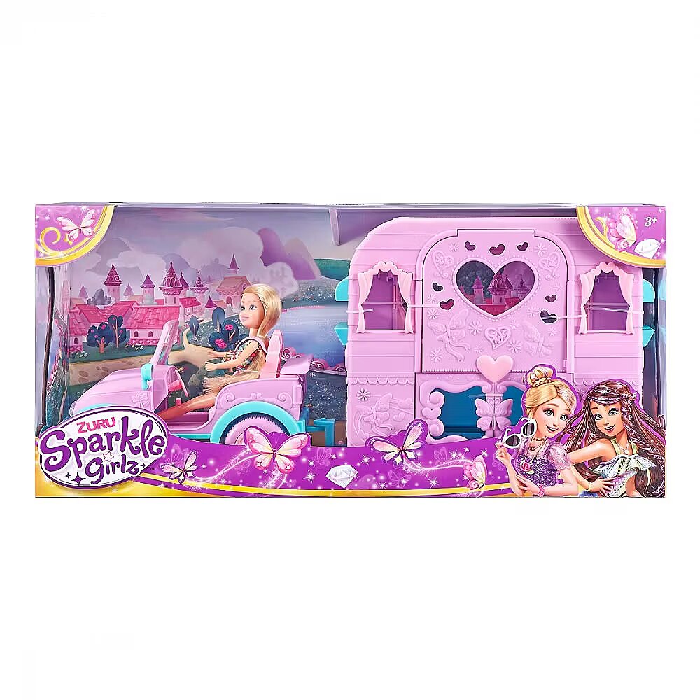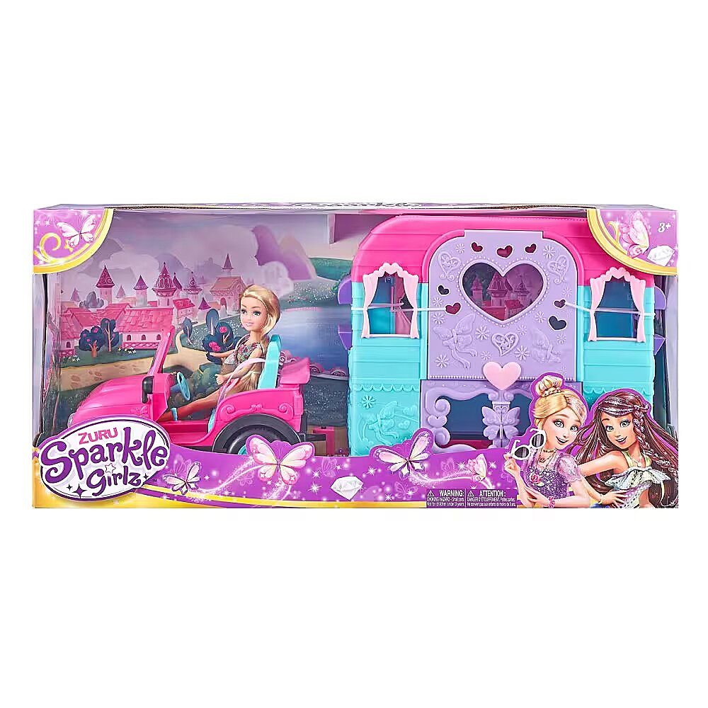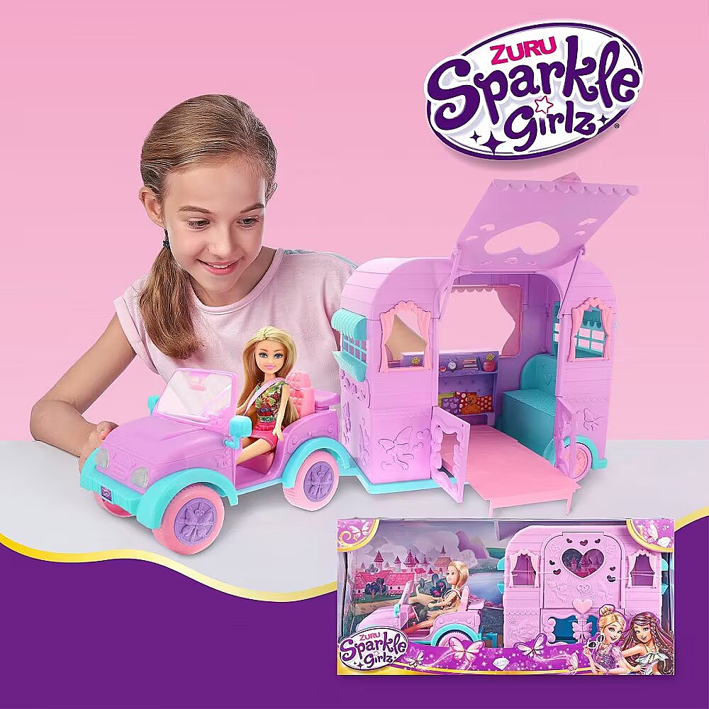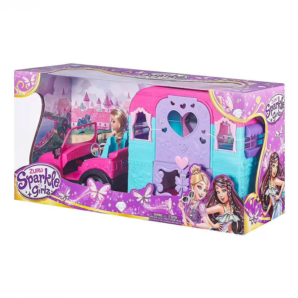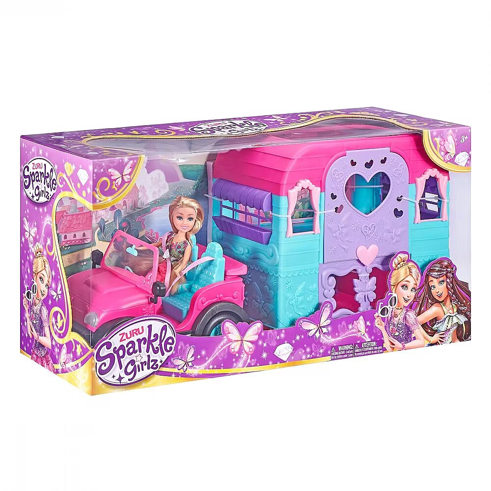 LongDesc - Sparkle Girlz Deluxe Caravan Set ZURUZURU Sparkle Girlz Deluxe Caravan Set is the perfect playset for all your Sparkle Girlz adventures! Buckle in to your purple jeep with your friends, pack your bags and set off! Caravan opens up and includes a fold out bed for overnight trips. Caravan is detachable and wheels really move! Sparkle all day at an amazing value too!