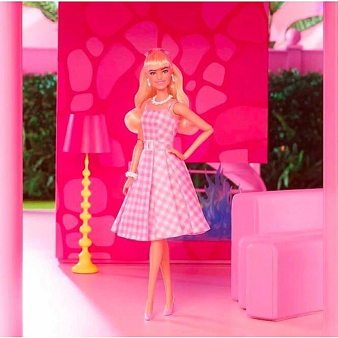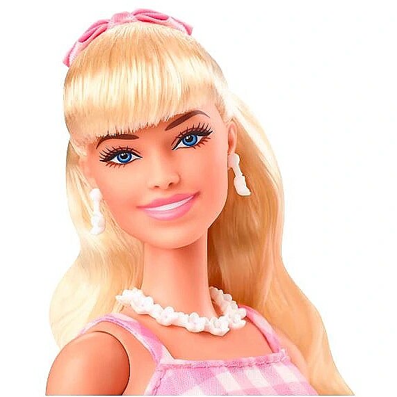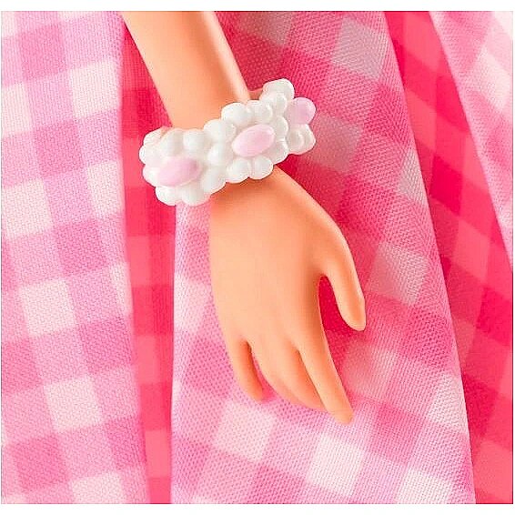 LongDesc - Greetings from Barbie Land! This Barbie doll cuts a timeless silhouette in a sweet dress modeled after one of her character's iconic looks in Barbie The Movie. With her pink gingham dress, daisy necklace and pastel pumps, she's ready to have the best day ever in Barbie Land! In the likeness of Margot Robbie as Barbie, this doll makes a great gift for fans and collectors alike. Doll cannot stand alone. Colours and decorations may vary.