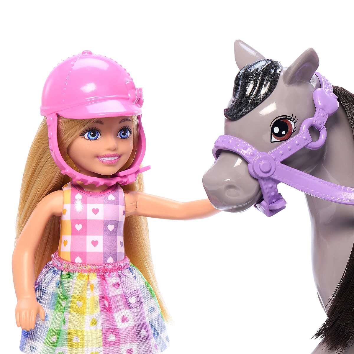 Description - Chelsea and her sweet pony are ready to ride into playtime! Strap on Chelsea doll's pink helmet and sit her on the pretty pink saddle. Help her hold the reins then giddy up! Chelsea doll's knees bend and feet loop in the stirrups for a realistic ride on her toy horse. The little gray pony has a soft mane and tail for petting fun. Kids can let their imaginations run wild with Chelsea and her horse! Doll cannot stand alone. Colors and decorations may vary.
