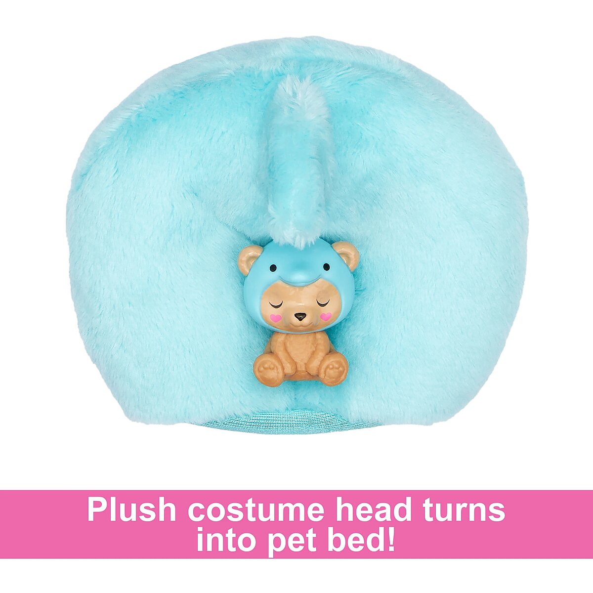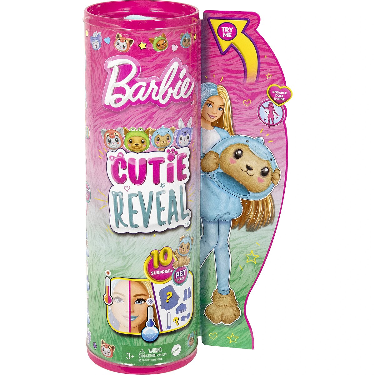 LongDesc - Barbie Cutie Reveal animal costume-themed dolls offer the cutest unboxing experience with 10 surprises! Discover a Kitten in a Red Panda costume, a Dog as a Frog, a Teddy Bear as a Dolphin or a Bunny as a Koala. Remove the plush costume to reveal a posable Barbie doll with long, colourful hair. Discover more surprises to open like a pair of shoes, a purse and a matching mini pet. Reverse the plush top for a fleece jacket and flip the costume head for a pet bed. Icy cold water adds even more cuteness with colour-change transformations on the doll's face and mini pet; warm water changes them back for repeat fun! Kids will love discovering -- and collecting -- all the cute surprises in this adorable Barbie Cutie Reveal series. Each doll sold separately, subject to availability. Dolls cannot stand alone. Colours and decorations may vary.