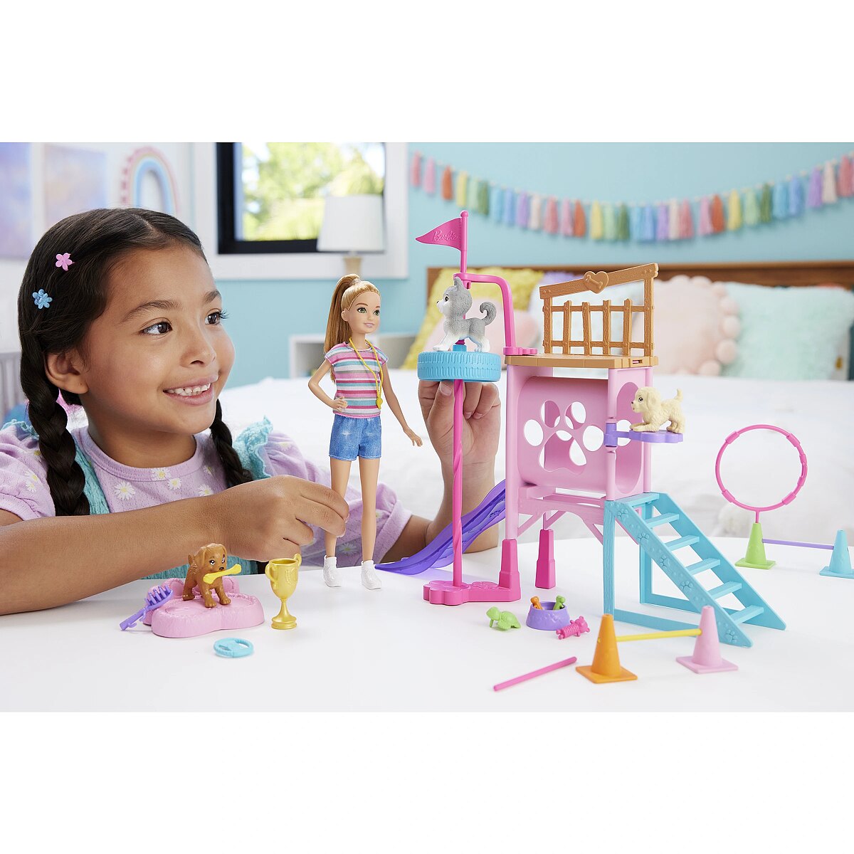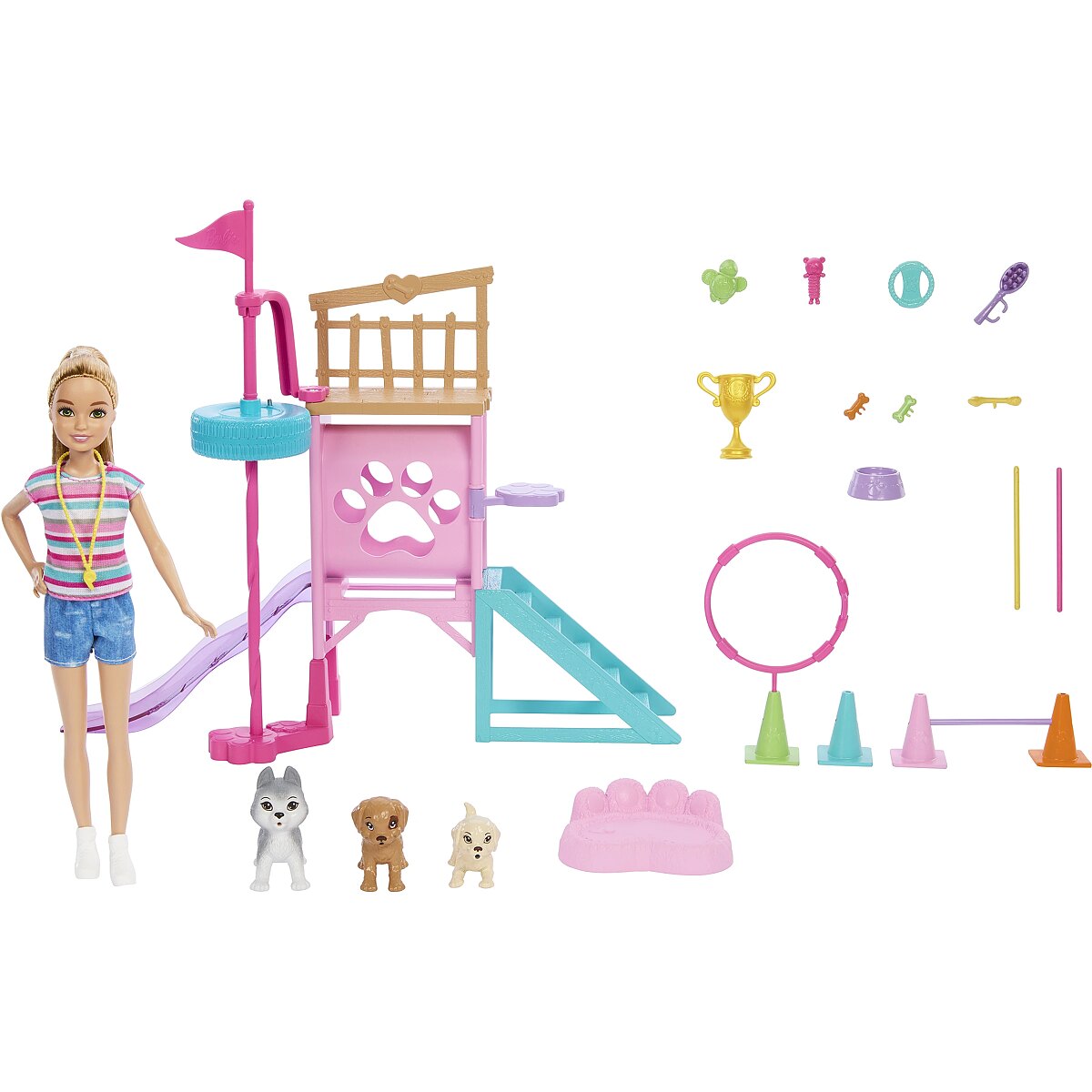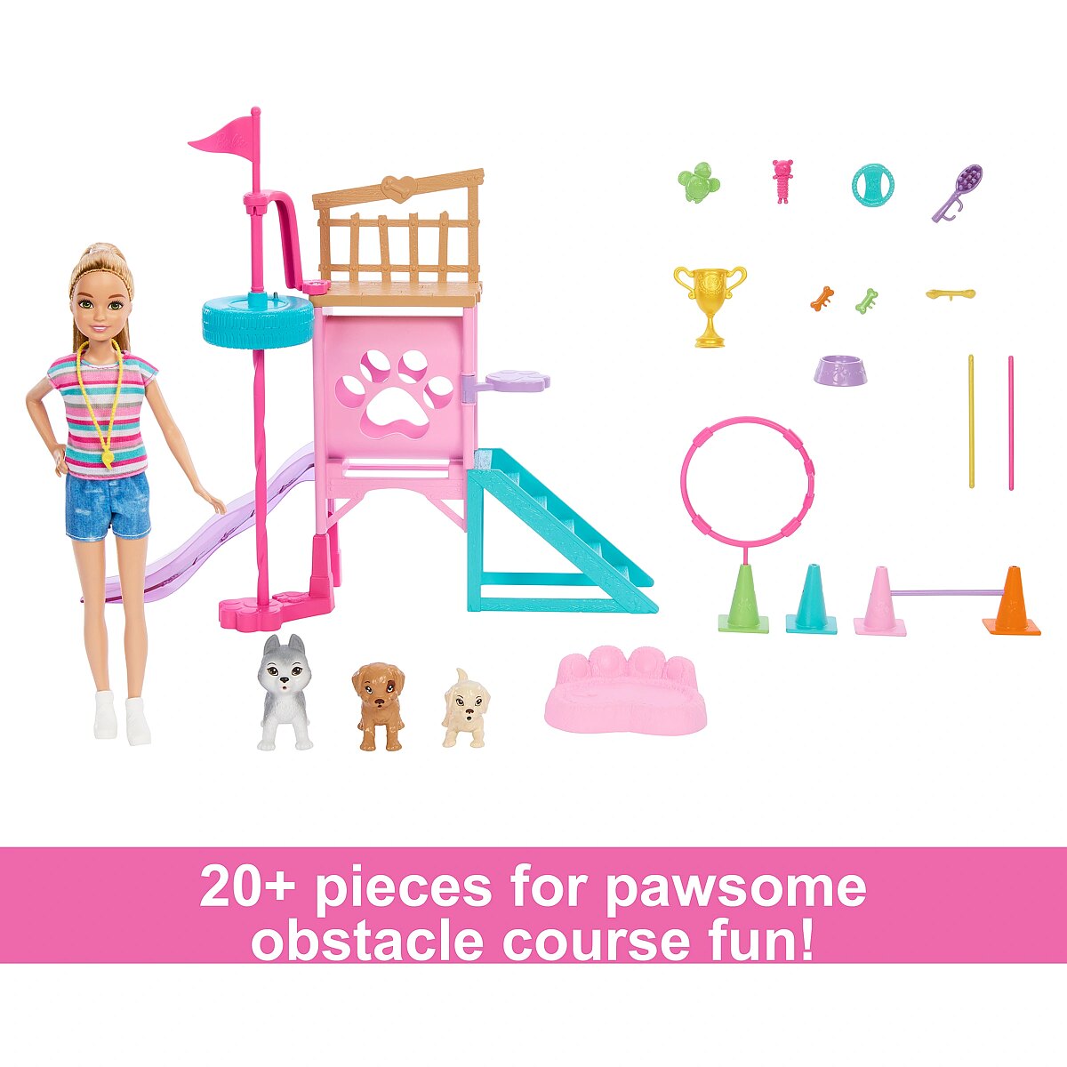 LongDesc - Pounce into fun with this puppy obstacle course playset! With 20+ total pieces, there are so many ways to play with Stacie doll and her pack of three pups. The dogs can spin down the tire tower, slip down the slide, jump through hoops, and so much more with this buildable puppy playground. Just like in the movie Barbie and Stacie to the Rescue, kids can help Stacie doll train and take care of her fur-ever friends with this buildable obstacle course and accessories like dog toys, treats, a trophy, and pet bed. Doll cannot stand alone. Colours and decorations may vary.