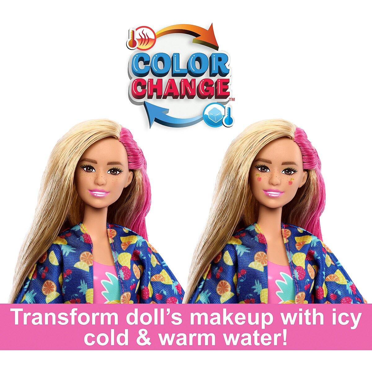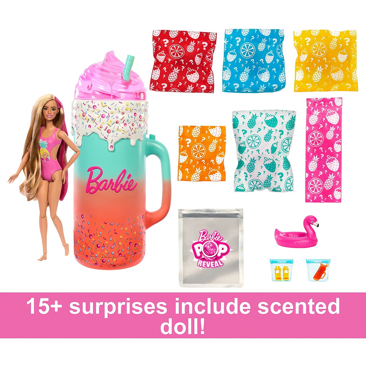 LongDesc - With the Barbie Pop Reveal Rise and Surprise doll and accessories gift set, playtime really pops! Unbox 15 surprises including a scented Barbie doll with colour-change makeup, a scented squishy pet, moldable sand, fashions and storytelling accessories. Unwrap, lift the cup lid and press the button on the handle to watch Barbie doll rise to the top -- repeat the wow moment again and again. Pop the ice cubes open and discover the surprises inside; they're reusable for more repeat fun! Mystery bags hold additional accessories. There's a fruit-print cover-up, pair of shoes, floaties, a bag of moldable sand and more. Style Barbie for a day of fun in the sun and switch up her look with colour change on her face. Kids will love discovering all the possibilities for play in this surprise-filled gift set! Doll cannot stand alone. Colours and decorations may vary.