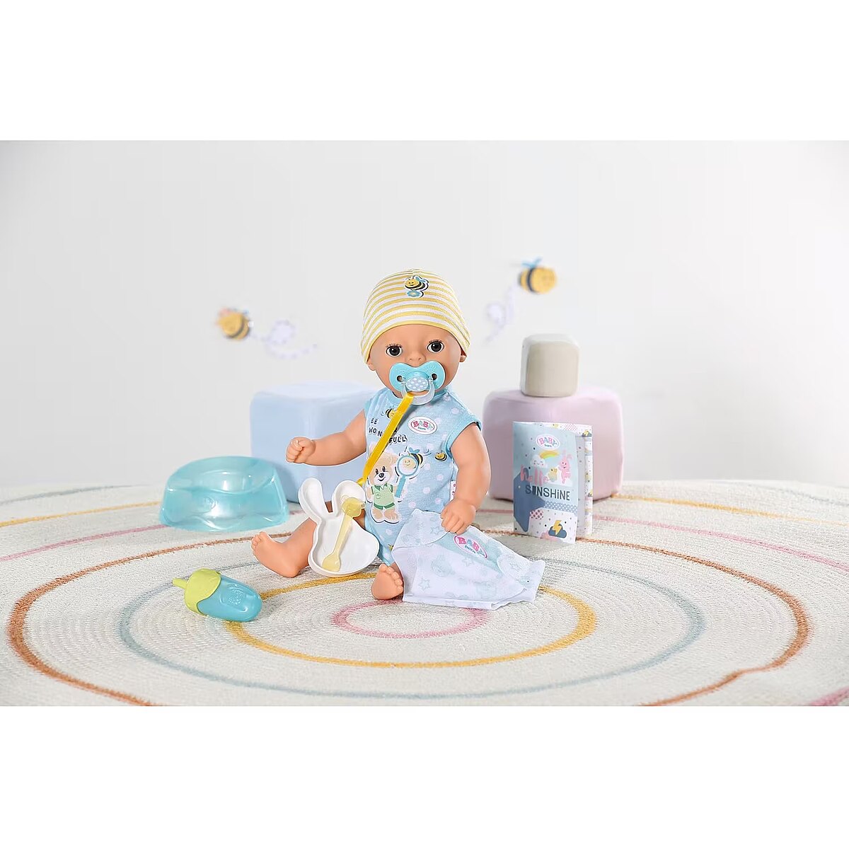 LongDesc - BABY born Little Baby Boy has 7 great functions that all work without batteries. He comes with everything he needs for this. He can drink water from his bottle, change his nappy or go on his blue potty. If you give him the dummy and turn it to the left, he closes his eyes; if you turn it to the right, he opens his eyes. If you put him to sleep in his cot, he closes his eyes even without a dummy. His arms, legs and head are super manoeuvrable and make dressing and undressing him child's play. At 36 cm, it is suitable for smaller children's hands from the age of one and is the perfect doll for starting out with varied baby play. They can even sit on the potty together and playfully help your child to get dry.
