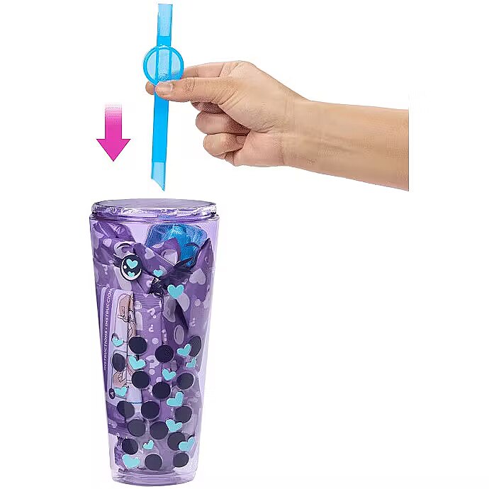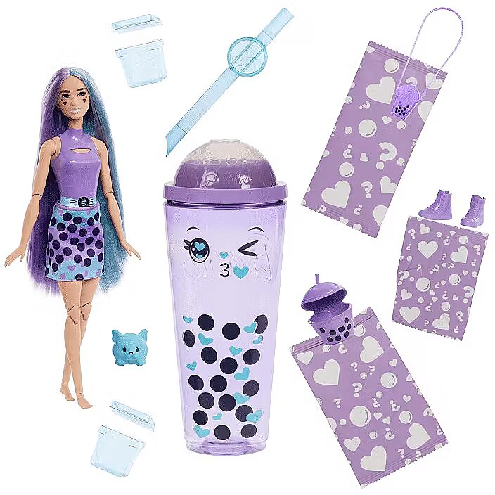 LongDesc - Barbie Pop Reveal Bubble Tea Series dolls offer a sensory unboxing experience with eight surprises! Unscrew the lid with the Slime and poke through the film with the straw for squishy fun. Peel the film on the cup to reveal a bubble tea-scented Barbie doll and eight more surprises! Which doll will you reveal? There's Taro Milk, Berry Bliss, Green Tea or Mango Mochi. Continue unboxing to discover two reusable ice cubes that pop open to reveal a skirt and pair of shoes. Mystery bags reveal a straw, a purse and a squishy, scented matching pet! Discover more wow with colour-change transformations on Barbie doll's face. Kids will want to collect them all! Each doll sold separately, subject to availability. Dolls cannot stand alone. Colours and decorations may vary.