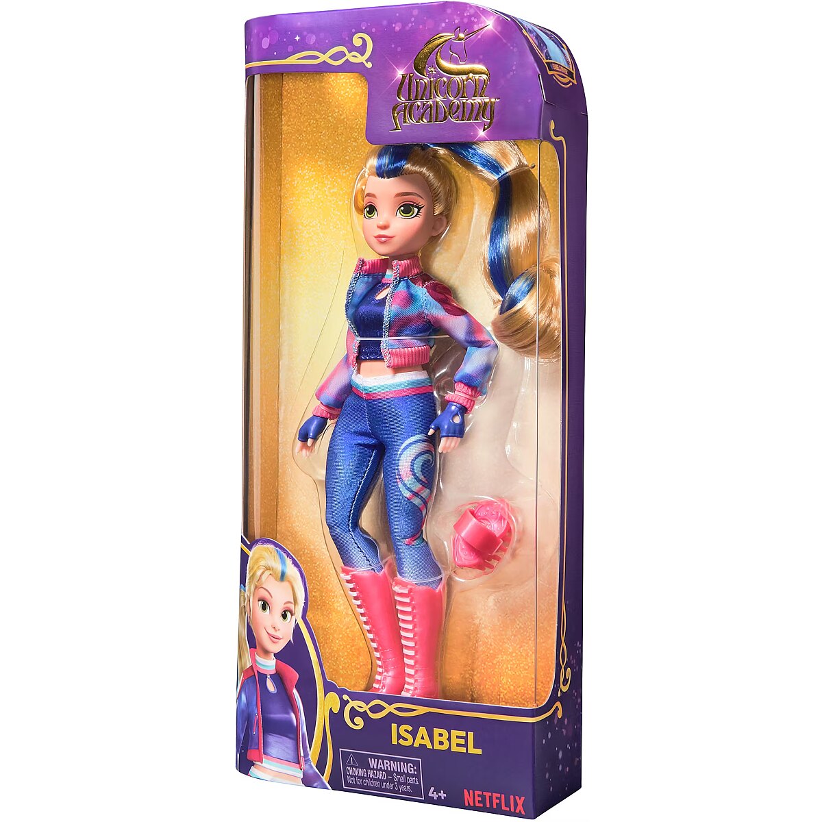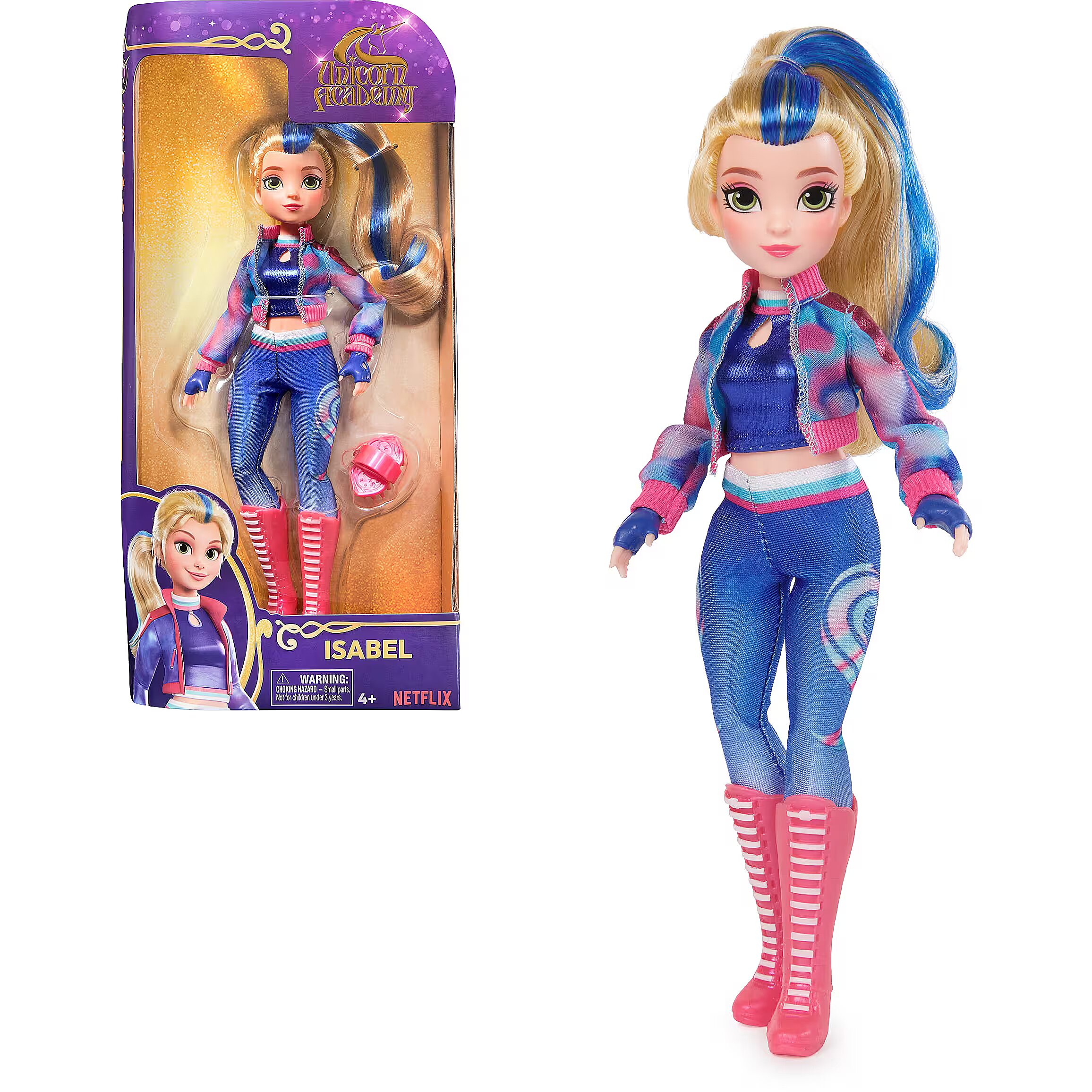 LongDesc - Create enchanting Unicorn Academy adventures at home with Sophia, Ava, and Isabel fashion dolls. Inspired by the NETFLIX animated show and best-selling book series where friendship reins, these 9.5-inch dolls for girls bring the characters to life. Beautifully detailed from head to toe, Isabel’s sporty personality comes through in her brushable blue highlighted hair (styling accessory included) and her signature unicorn rider outfit: banded top and cropped riding jacket, riding pants with Water Magic markings, pink lace up boots, and riding gloves doll accessories. With 9 points of articulation, pose Isabel as you protect Unicorn Island and its magic, and ride into adventure with her unicorn, River (sold separately). The magical bonds between Unicorn Academy students and their unicorns will spark endless imaginative storytelling. For more ways to experience Unicorn Academy with your favorite characters, look for Sophia and Ava dolls and their unicorns, Rainbow Light-up Wildstar and Leaf (each sold separately) and expand your world. For kids who enjoy unicorns and horse toys, dolls & accessories, doll house play, collectibles, plush toys and more, Unicorn Academy toys are fun birthday gifts for girls or gifts for any occasion. Bring home the magic of Unicorn Academy with the Isabel Doll.Includes: 1 Doll, 5 Removable Fashion Pieces, 1 Hair Styling Tool