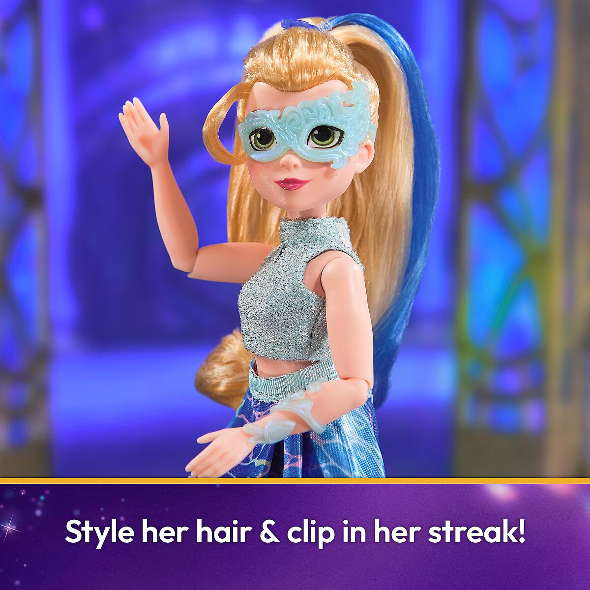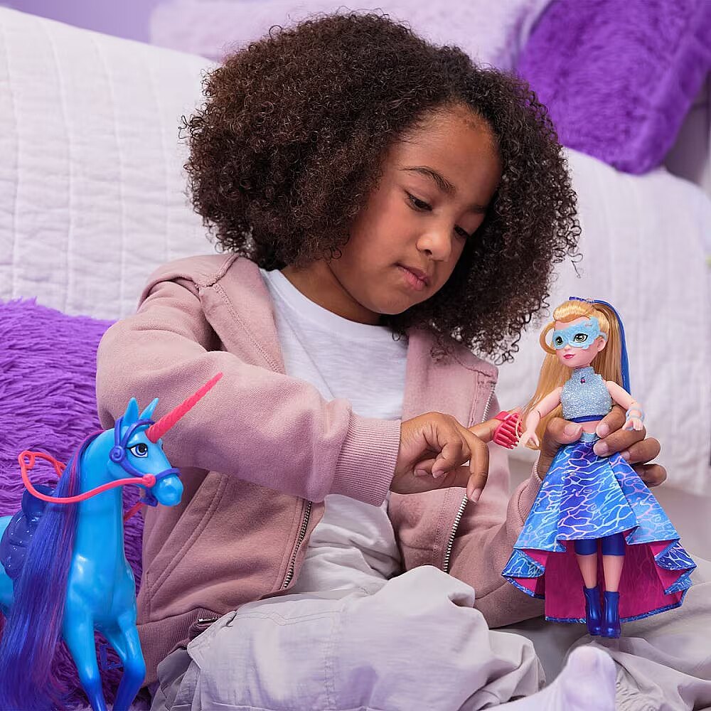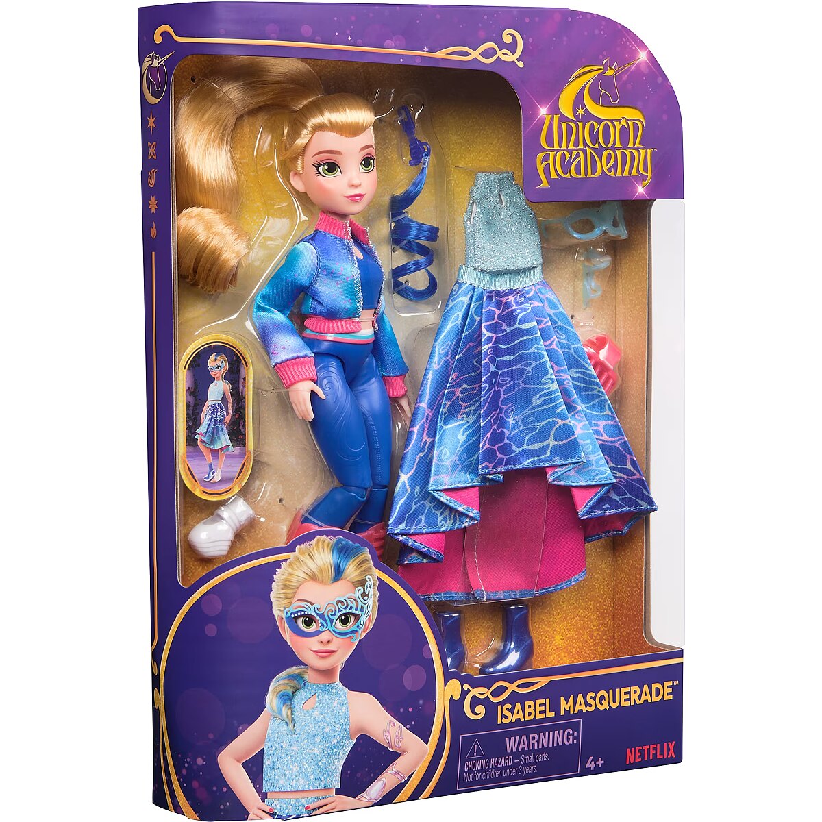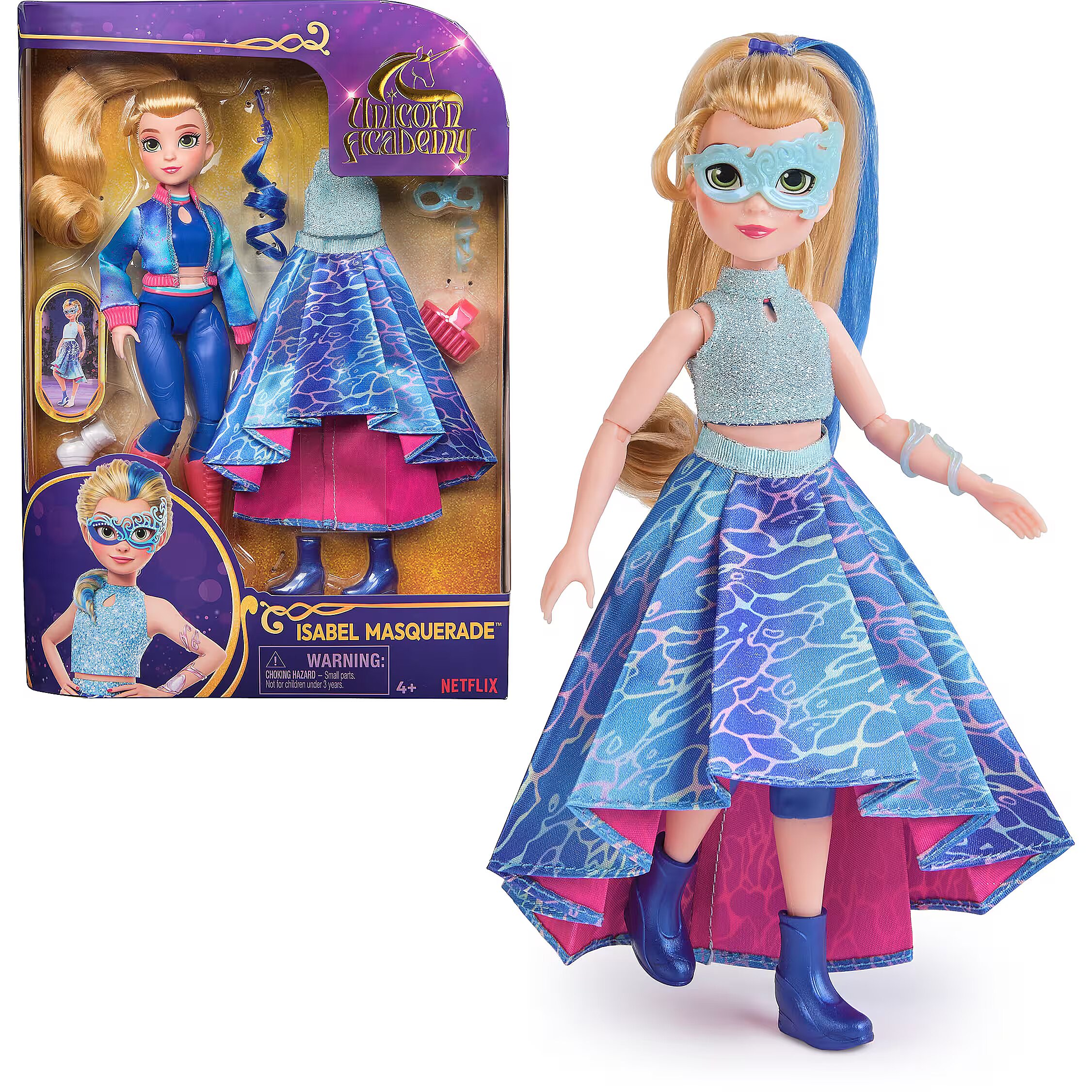 LongDesc - Celebrate the magic of the Fate Faeries at the Unicorn Academy masquerade ball with the Isabel Masquerade doll. Inspired by the NETFLIX animated show and best-selling books, this 9.5-inch fashion doll brings Isabel to life. Featuring authentic details and 11 doll accessories, Isabel comes in her riding gear, ready to ride into adventure with her unicorn, River (sold separately). When it’s time for the ball, switch Isabel from her removable jacket and boots into her printed asymmetrical skirt and sparkly top, mask, and masquerade booties or foot cast. Style her ponytail with the hair tool and clip in her blue hair streak. With 9 points of articulation, pose Isabel as you recreate scenes from the show. For more ways to experience Unicorn Academy with your favorite characters, expand your world with all of the rider dolls and their unicorns (each sold separately). The magical bonds between Unicorn Academy students and their unicorns will spark endless imaginative storytelling. For kids who enjoy unicorns and horse toys, dolls & accessories, doll house play, collectibles, plush toys and more, Unicorn Academy toys are fun birthday gifts for girls or gifts for any occasion. Bring home the Unicorn Academy deluxe Isabel Masquerade doll.Includes: 1 Doll, 10 Removable Fashion Pieces, 1 Hair Styling Tool