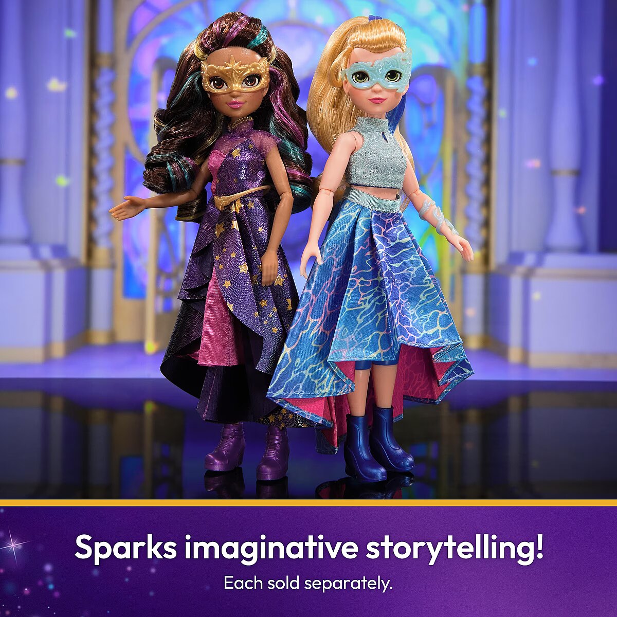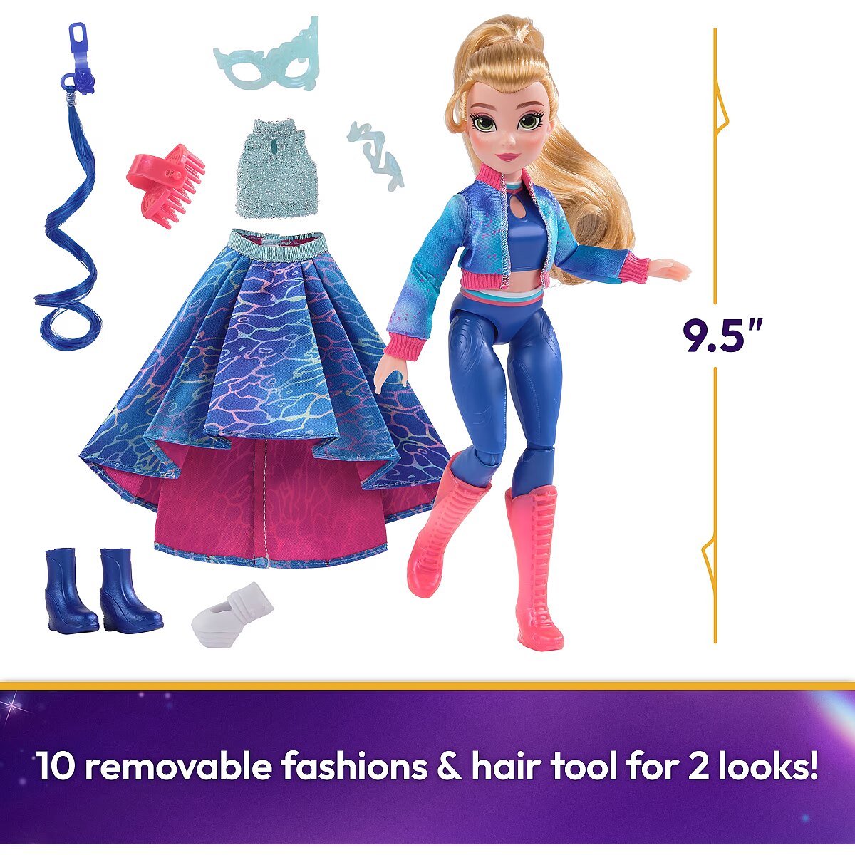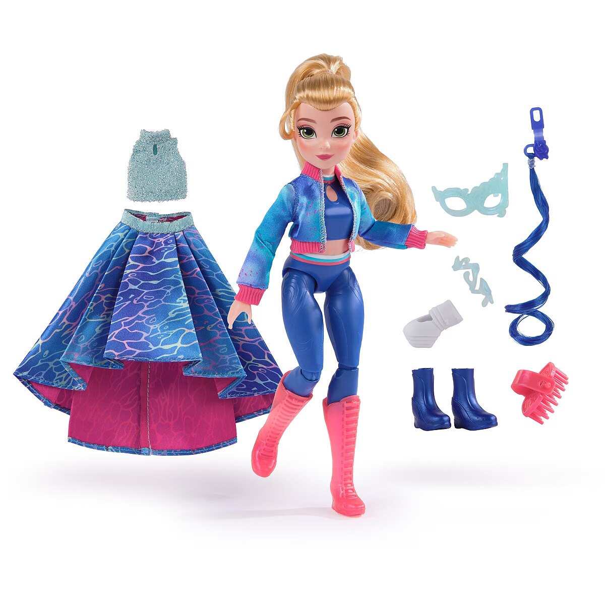 LongDesc - Celebrate the magic of the Fate Faeries at the Unicorn Academy masquerade ball with the Isabel Masquerade doll. Inspired by the NETFLIX animated show and best-selling books, this 9.5-inch fashion doll brings Isabel to life. Featuring authentic details and 11 doll accessories, Isabel comes in her riding gear, ready to ride into adventure with her unicorn, River (sold separately). When it’s time for the ball, switch Isabel from her removable jacket and boots into her printed asymmetrical skirt and sparkly top, mask, and masquerade booties or foot cast. Style her ponytail with the hair tool and clip in her blue hair streak. With 9 points of articulation, pose Isabel as you recreate scenes from the show. For more ways to experience Unicorn Academy with your favorite characters, expand your world with all of the rider dolls and their unicorns (each sold separately). The magical bonds between Unicorn Academy students and their unicorns will spark endless imaginative storytelling. For kids who enjoy unicorns and horse toys, dolls & accessories, doll house play, collectibles, plush toys and more, Unicorn Academy toys are fun birthday gifts for girls or gifts for any occasion. Bring home the Unicorn Academy deluxe Isabel Masquerade doll.Includes: 1 Doll, 10 Removable Fashion Pieces, 1 Hair Styling Tool