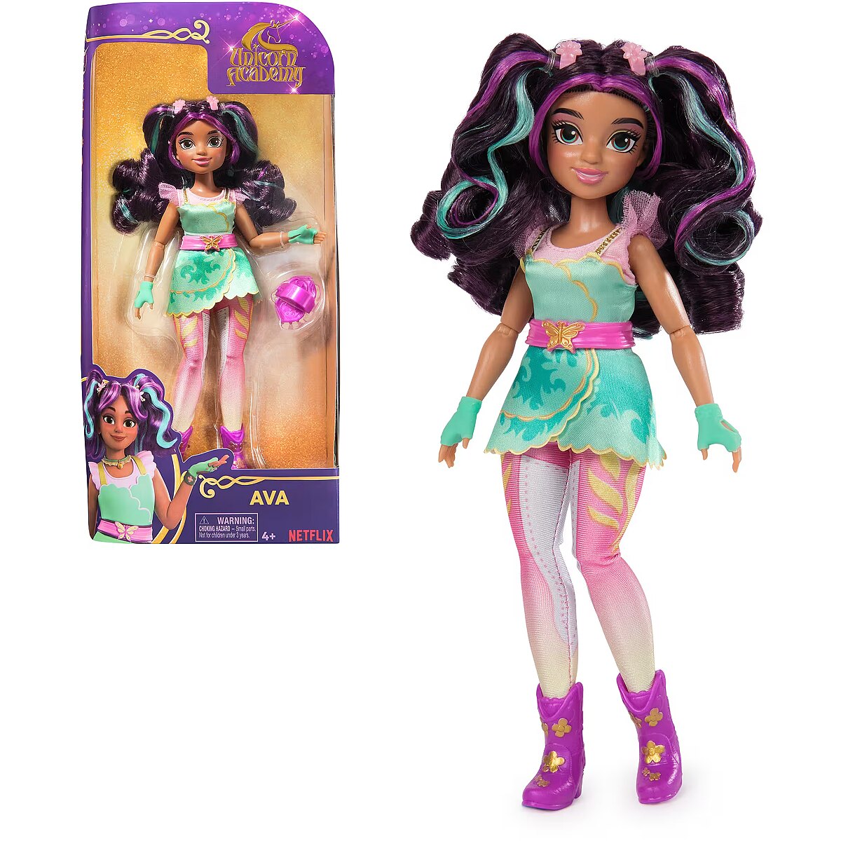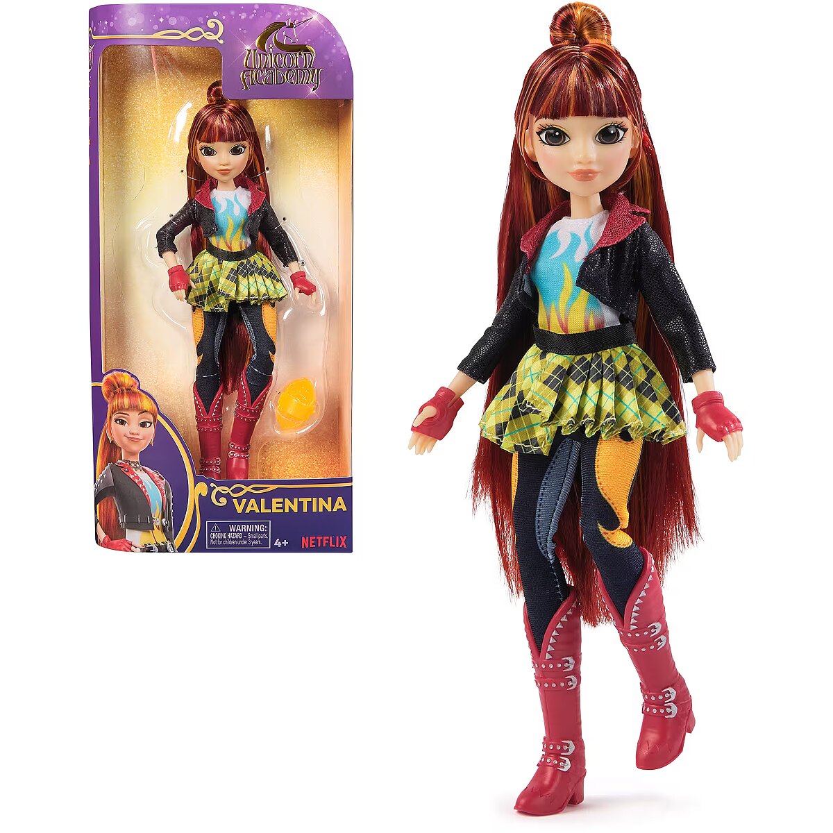LongDesc - Create enchanting Unicorn Academy adventures at home with the Sophia, Ava, Isabel, Layla and Valentina fashion dolls. Inspired by the NETFLIX animated show and best-selling book series where friendship reins, these 9.5-inch dolls for girls bring the characters to life. Beautifully detailed from head to toe, Valentina’s fiesty personality comes through in her brushable red, orange and yellow highlighted hair (styling accessory included) and her signature unicorn rider outfit: black riding jacket, plaid skirt, riding pants with Fire Magic markings, studded red boots, and riding gloves doll accessories. With 9 points of articulation, pose Valentina as you protect Unicorn Island and its magic, and ride into adventure with her unicorn, Cinder (sold separately). The magical bonds between Unicorn Academy students and their unicorns will spark endless imaginative storytelling. For more ways to experience Unicorn Academy with your favorite characters, look for all of the rider dolls and their unicorns (each sold separately) and expand your world. For kids who enjoy unicorns and horse toys, dolls & accessories, doll house play, collectibles, plush toys and more, Unicorn Academy toys are fun birthday gifts for girls or gifts for any occasion. Bring home the magic of Unicorn Academy with the Valentina doll.Includes: 1 Doll, 5 Removable Fashion Pieces, 1 Hair Styling Tool