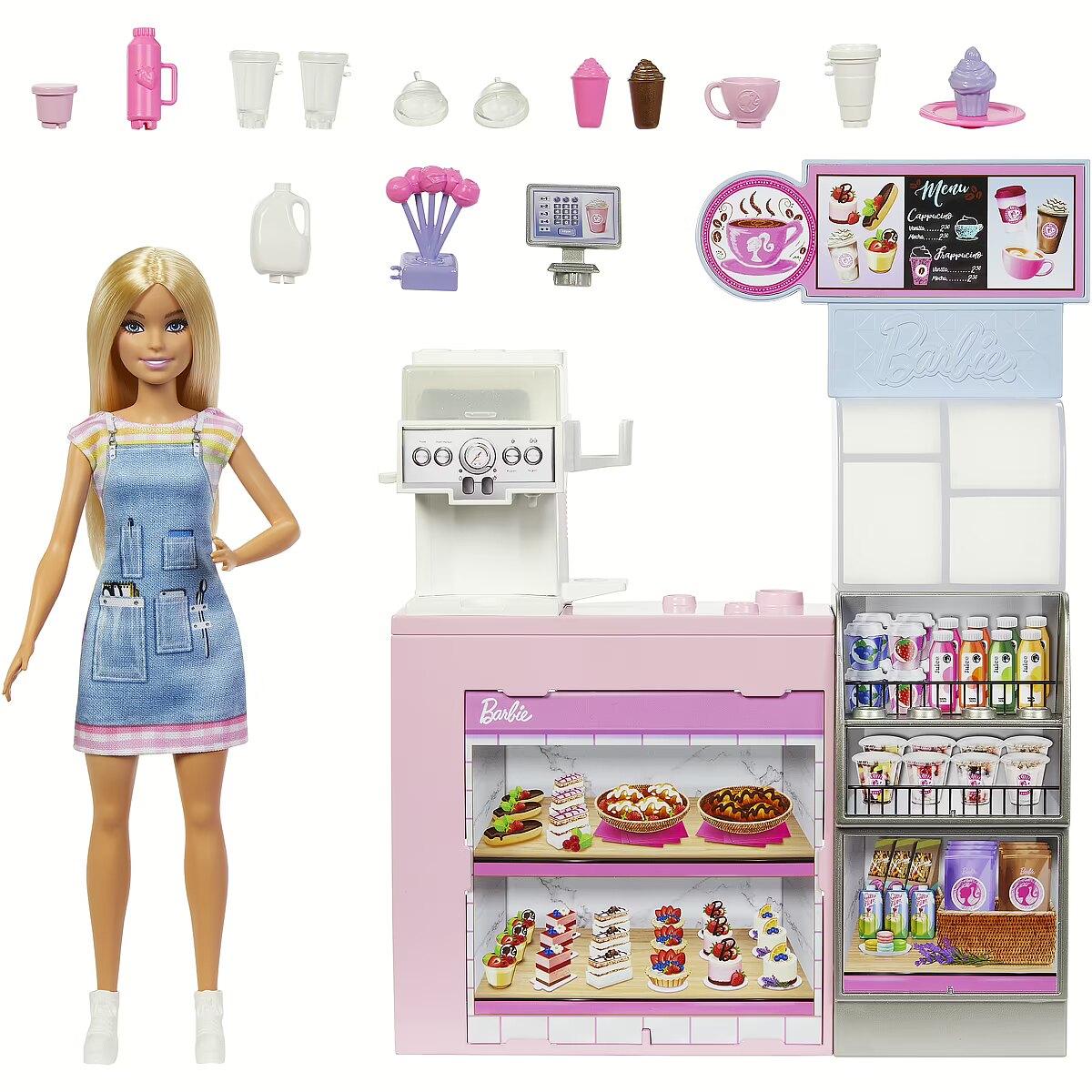 LongDesc - With Barbie doll and her Coffee Shop playset, imaginations can serve up the best coffee -- and biggest dreams -- in the world! The café counter features a coffee/smoothie machine with different flavors, just turn the dial to choose. Tea and snacks are also on the menu. Additional accessories to kickstart story ideas include a jug of milk, coffee cups, smoothie cups, a tea cup and more. Wearing an apron-inspired look, Barbie doll can ring customers up at the register for role-play fun. More than 12 storytelling pieces -- some that clip onto Barbie doll's hands -- offer endless possibilities to explore storytelling and career opportunities! Doll cannot stand alone. Colours and decorations may vary.