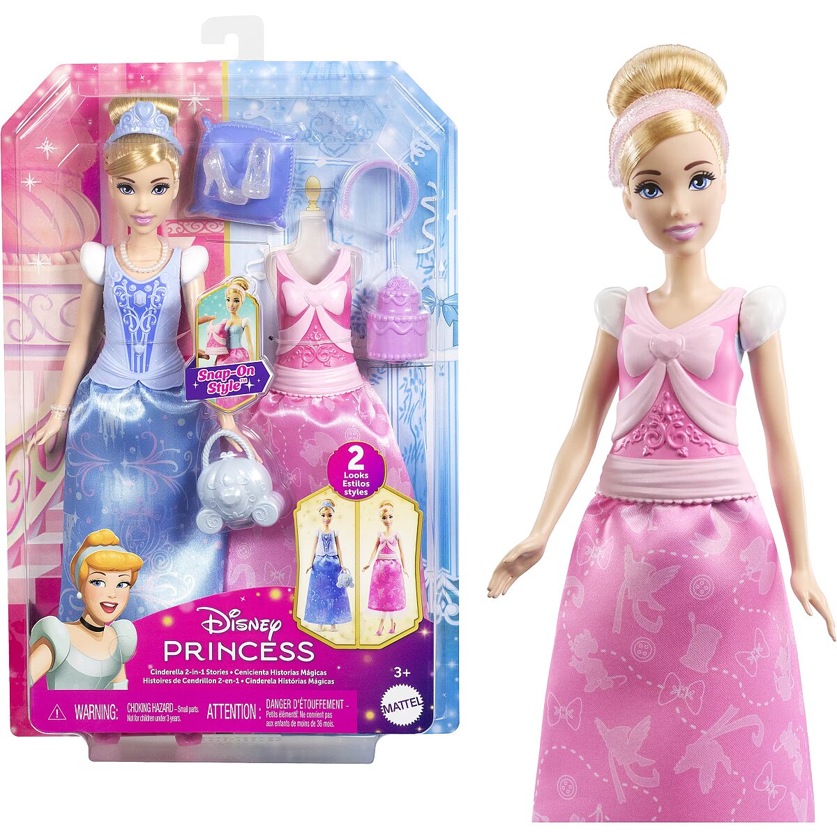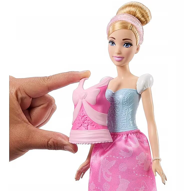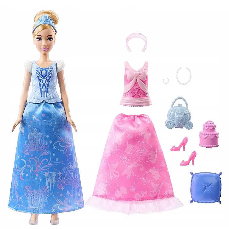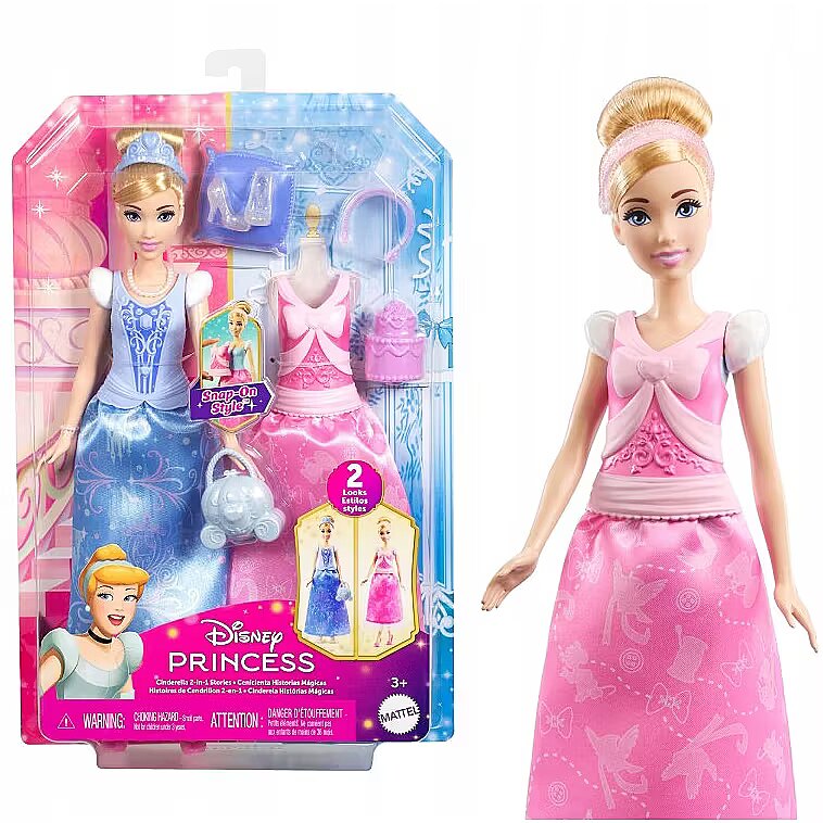 LongDesc - Disney Princess 2-in-1 Stories Cinderella fashion doll set is inspired by favourite moments from the classic Disney movie! Posable Cinderella doll features two distinct looksgoing to the ball or celebrating a birthdayand include two easy-to-use, snap-on bodices; two soft skirts; and nine themed accessories. It's the perfect gift for Disney fans eager for more Cinderella stories! Doll cannot stand alone. Colours and decorations may vary.
