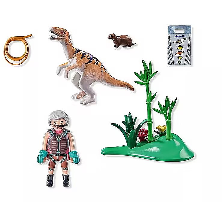 Accessories included - Figurki: mężczyzna Zwierzęta: Welociraptor, gryzoń Akcesoria: mapa, lasso, łącznik, podstawka, 2 trawy, 2 bambusy, jagoda, kwiat z łodygą