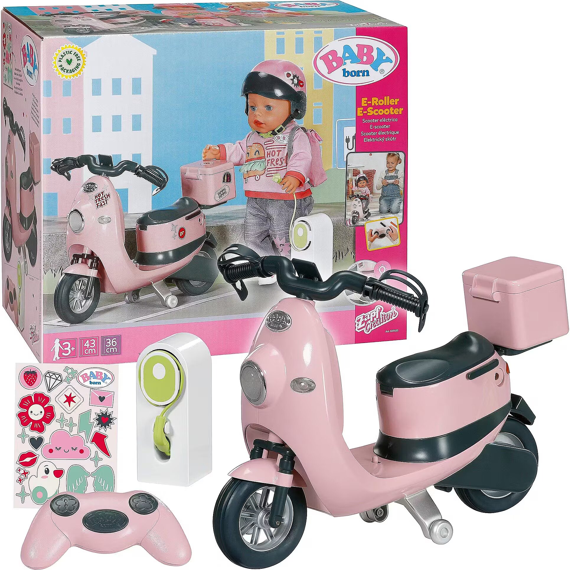 LongDesc - The best way to get around town is on a little scooter - which is why BABY born is also taking to the streets with her new, modern e-scooter. It can be controlled by remote control and travels forwards and backwards. Of course, an e-scooter like this also needs to be charged:During the charging process, the rear light lights up when it comes into contact with the charging station to authentically simulate the charging process. Have a safe journey BABY born!