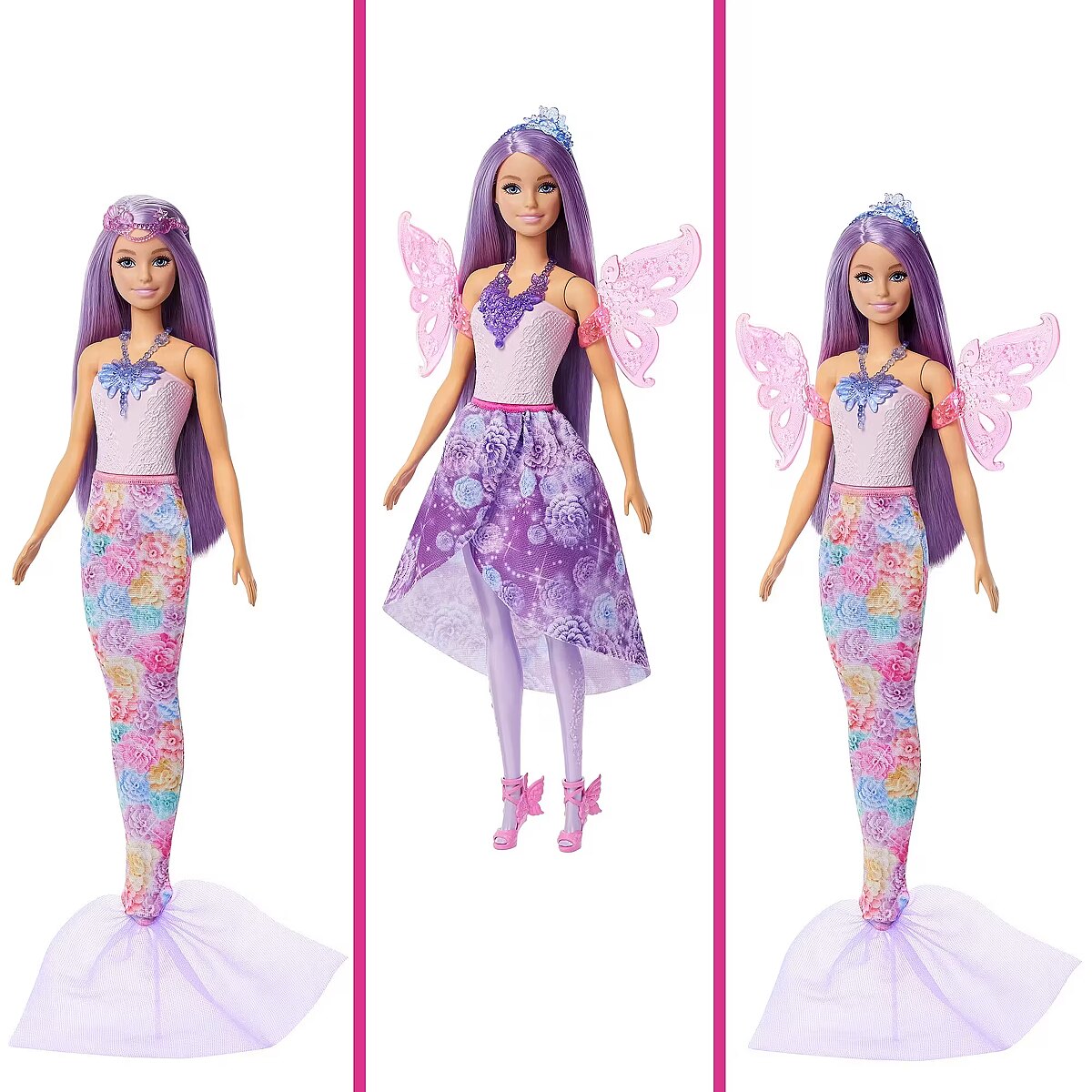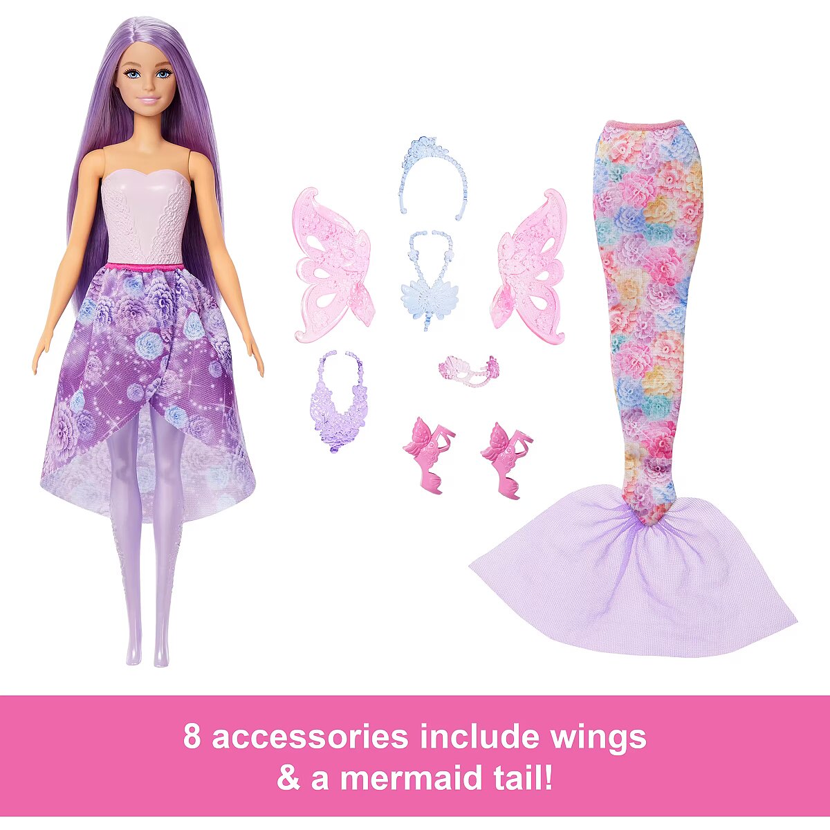 Accessories included - 1 doll 1 mermaid tail 1 skirt 1 pair of wings 2 headbands 2 necklaces 1 pair of shoes