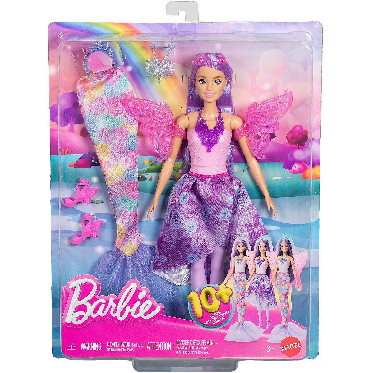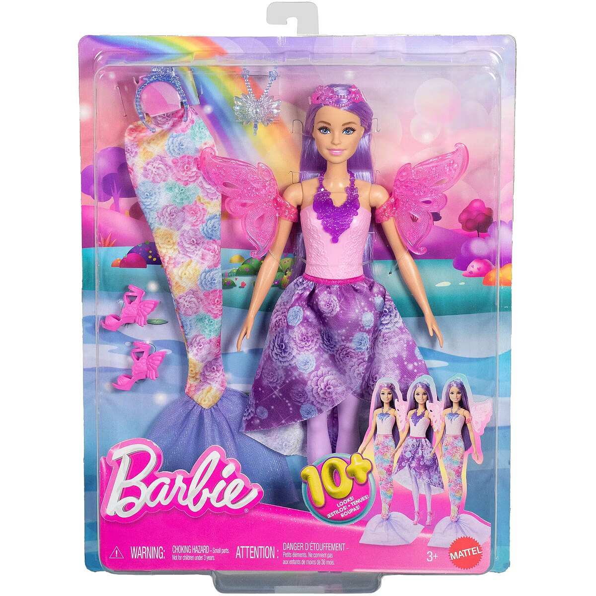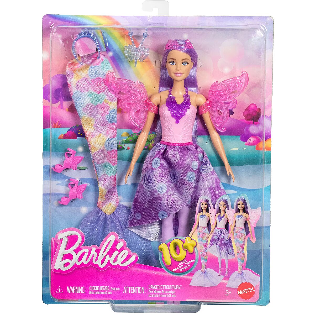 Description - Barbie Fairytale Dress-Up Doll Mix and match accessories to create over 10 looks with the Barbie Fairytale Dress-Up set! This fashion set includes 8 pieces, such as a mermaid tail, fairy wings, skirt, and accessories. Style Barbie to match all kinds of fairytale adventures guided by imagination, from the depths of the sea to the skies above! Colors and decorative elements may vary. Mix and match accessories to create over 10 outfits for Barbie with the Barbie Fairytale Dress-Up set! This magical fashion set includes 8 pieces, such as a mermaid tail, fairy wings, skirt, and accessories. Style Barbie to change her look and enjoy fairytale adventures from the ocean depths to the skies! Put on the mermaid tail or skirt, attach the fairy wings, and complete outfits with royal headbands and necklaces. Children aged 3 and up can dress up Barbie and immerse themselves in a world of magical stories.