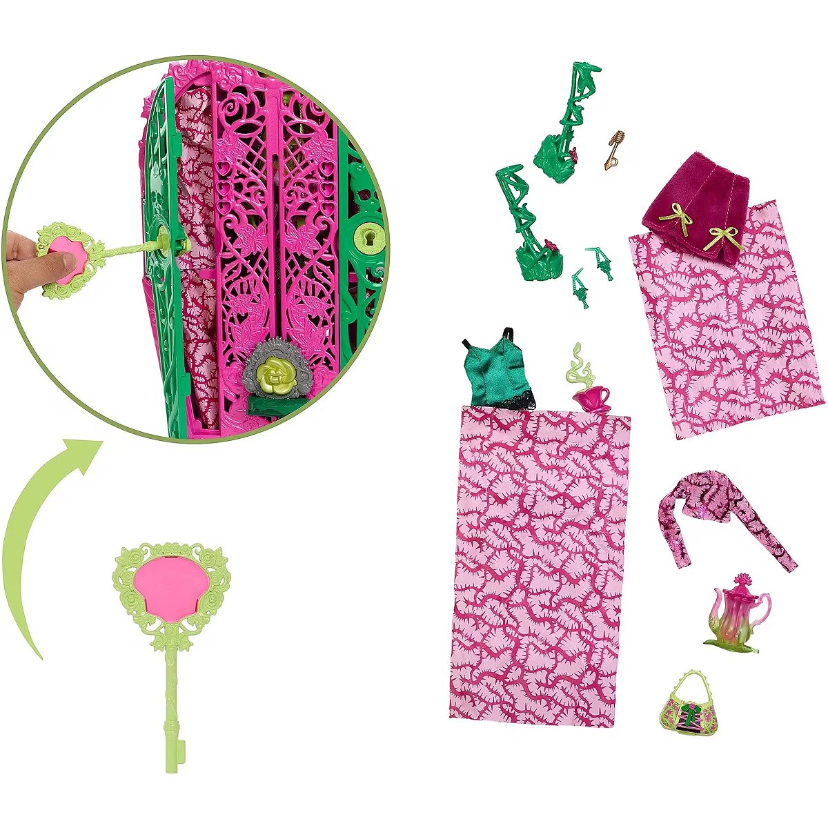 Accessories included - Lalka Monster High Szafa z dwojgiem drzwi Klucz 2 mapy 3 elementy do złożenia w talizman-klucz 2 wieszaki Ubranka i akcesoria dla lalki