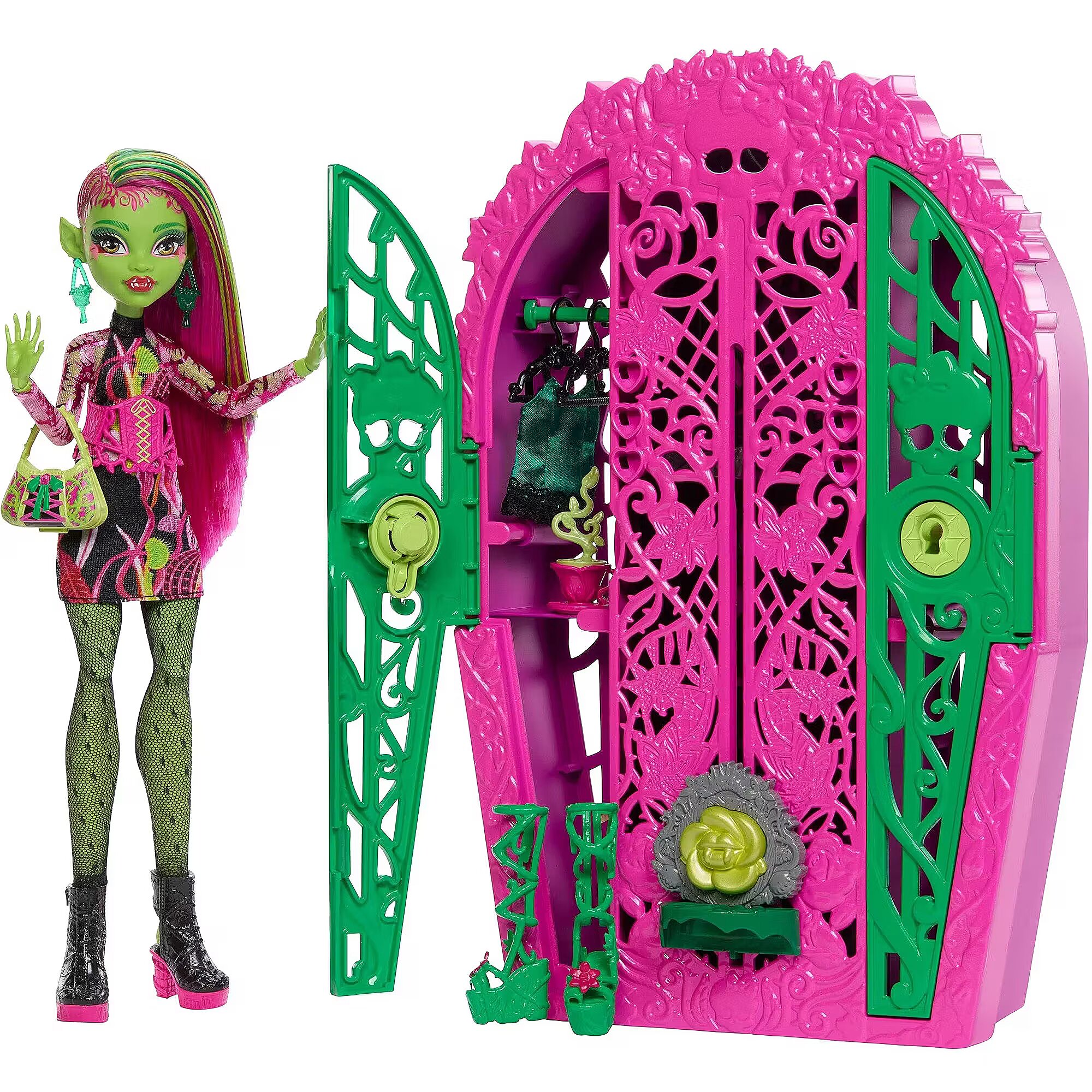 Packaging content - Packaging content - Includes 1 Venus McFlytrap doll, 1 closet with two doors, 1 key, 2 maps, 3 charms, 2 hangers, and assorted clothing and accessories. Doll cannot stand alone. Colours and decorations may vary.
