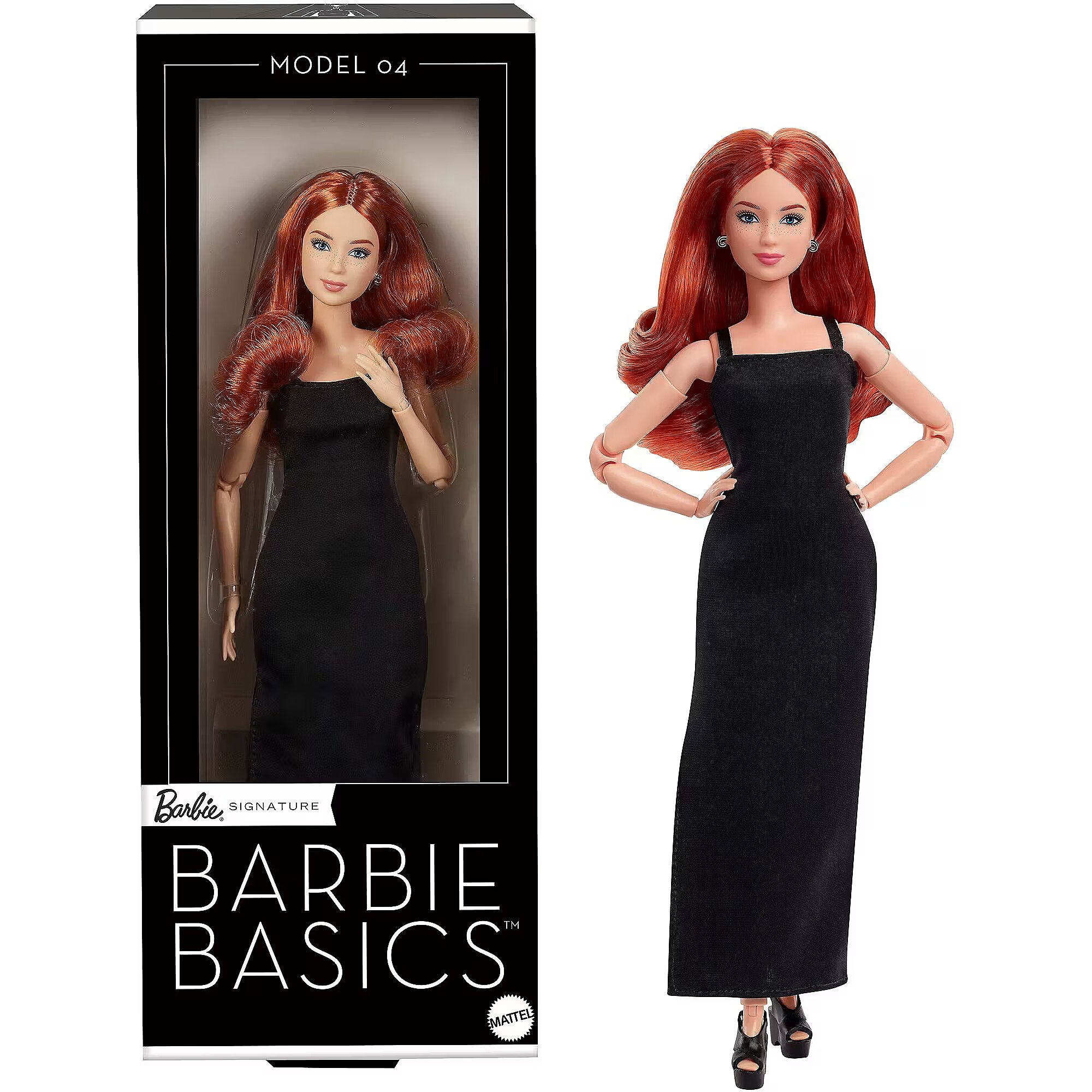 LongSummaryDescription - Barbie Basics Collectible Doll, Model 04 with Red Curly Hair, Black Dress & Platform Heels. Doll type: Fashion doll, Doll's gender: Female, Recommended age (min): 6 yr(s), Suggested gender: Boy/Girl. Height: 330.2 mm, Weight: 350 g. Material: Plastic, Product colour: Multicolour