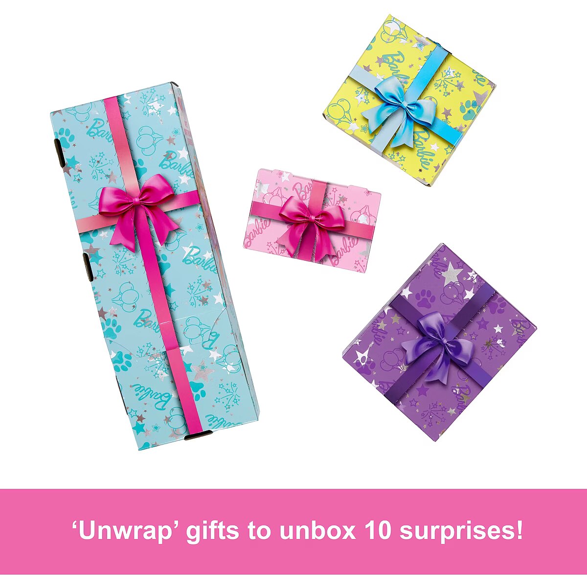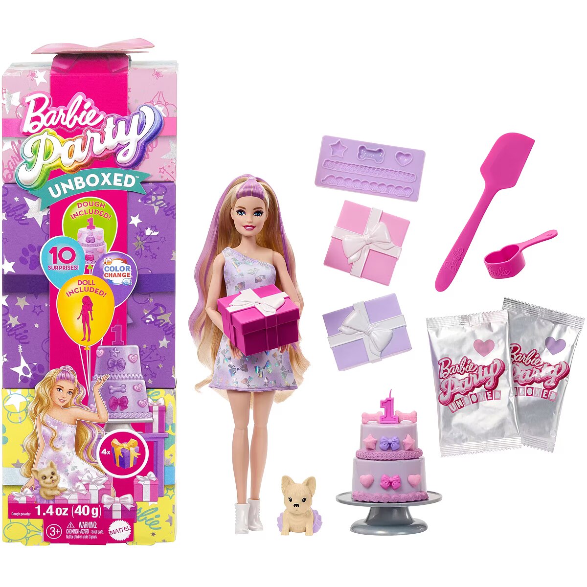 LongDesc - With 10 surprises in one package, Barbie Party Unboxed dolls deliver a unique unboxing experience with gift box-inspired packaging and pet birthday-themed fun! There are three dolls to collect: Birthday Bows, Shimmerin' Hearts or Party Stars. Which doll will you reveal? Keep 'unwrapping' the presents to find party fashions, an adorable pet with dress-up accessory and cake decorating tools. Young creatives can use the easy mix-and-make dough compound, mold tray and tools to make decorations for the included two-tier birthday cake and throw a pet birthday party. More surprises include colour-change on the doll's face and pet -- simply use icy cold and warm water to transform, change back and repeat again and again! Kids will love discovering the party inside this Barbie Party Unboxed Pet Birthday series and can collect them all to keep the party surprises going! Each doll sold separately, subject to availability. Dolls cannot stand alone. Colours and decorations may vary.