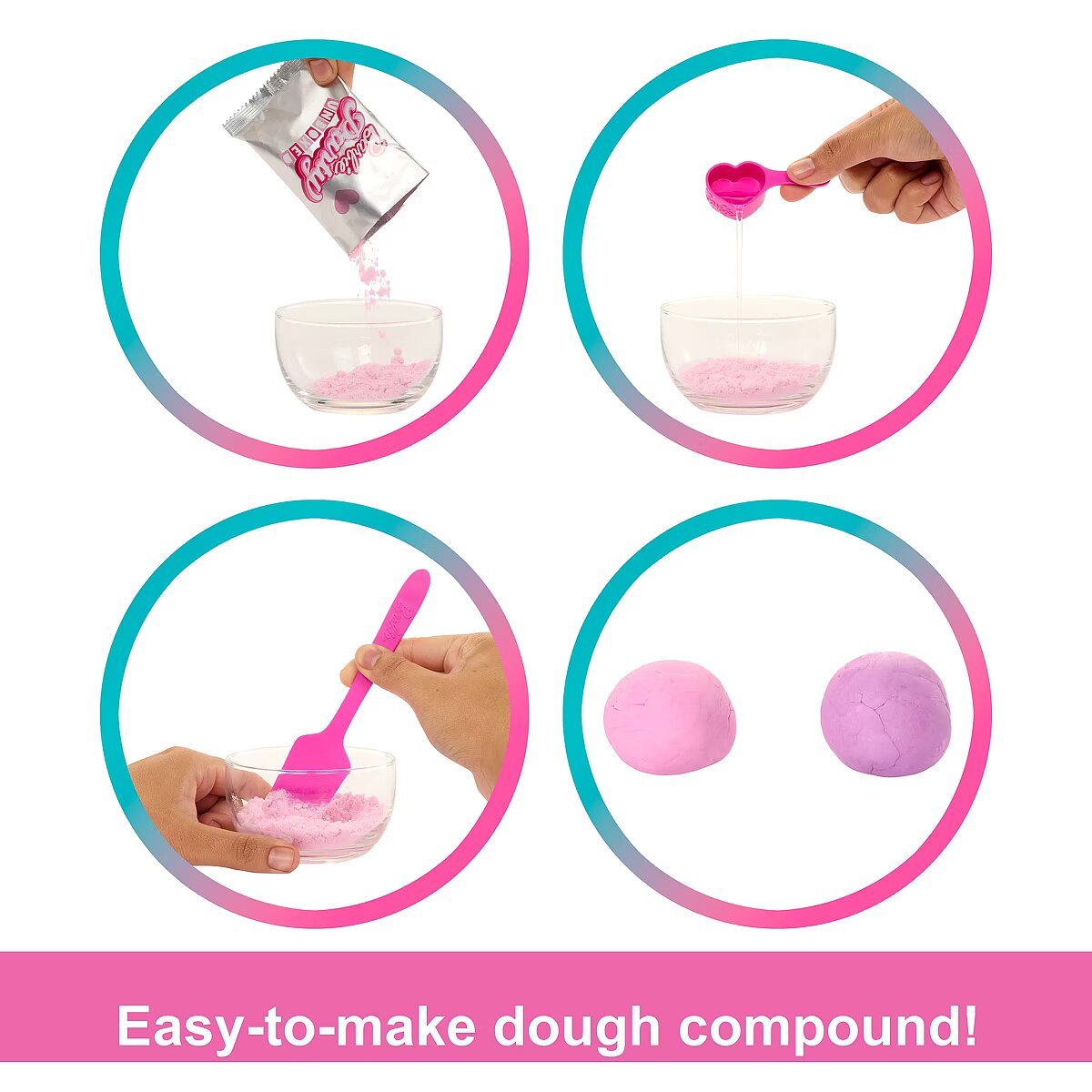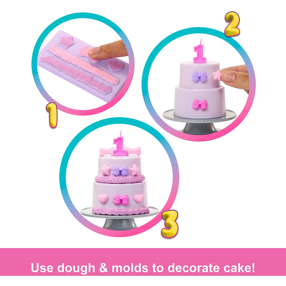 Packaging content - Packaging content - Includes Barbie fashion doll, 1 dress, 1 pair of shoes, 1 mini pet, 1 dough compound, 1 cake, 1 scoop, 1 spatula, 1 mold tray and 1 pet accessory. Doll cannot stand alone. Colours and decorations may vary.