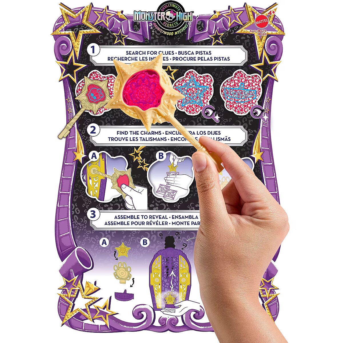 LongDesc - Solve the mystery, unlock the gates of Hauntlywood, and reveal a Monster High doll with Skulltimate Secrets: Hauntlywood Mysteries! Kids can play spooky detective by searching for clues on the map with the 'magic' magnifying glass key. Along the way they'll discover 19+ glam surprises like shimmery outfits, gore-geous elbow gloves, and blinged-out jewelry. Once playtime is over, kids ages 4 years old and up can stow the included doll, clothing, and accessories inside the star-studded closet, which is perfect for both storytelling and storage! Each sold separately, subject to availability. Fully articulated. Dolls cannot stand alone. Colours and decorations may vary.