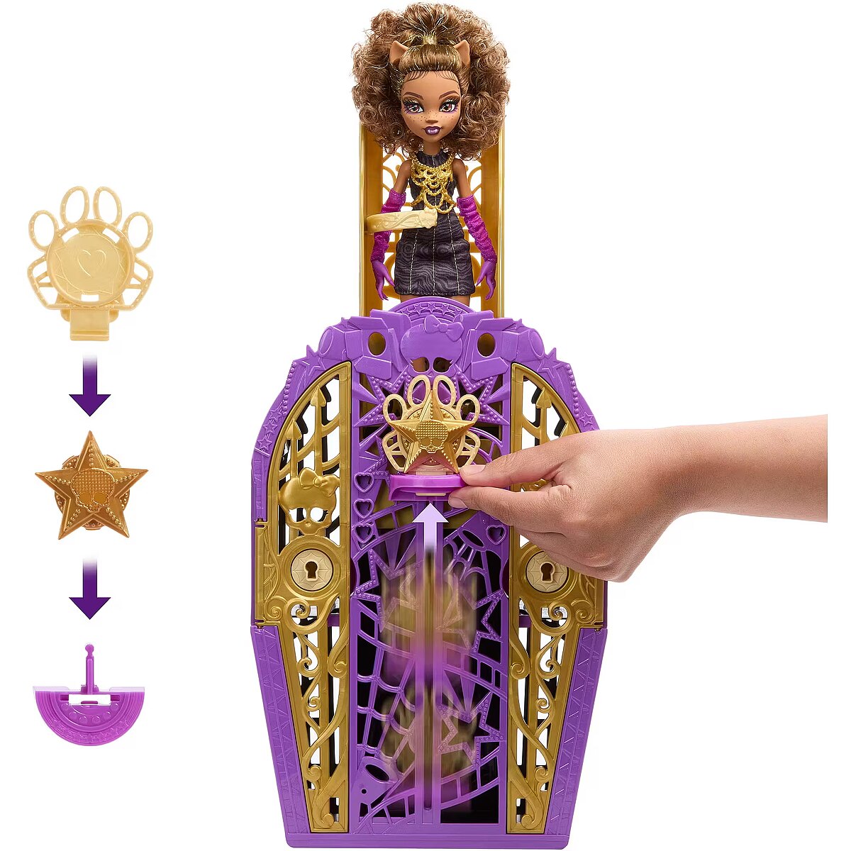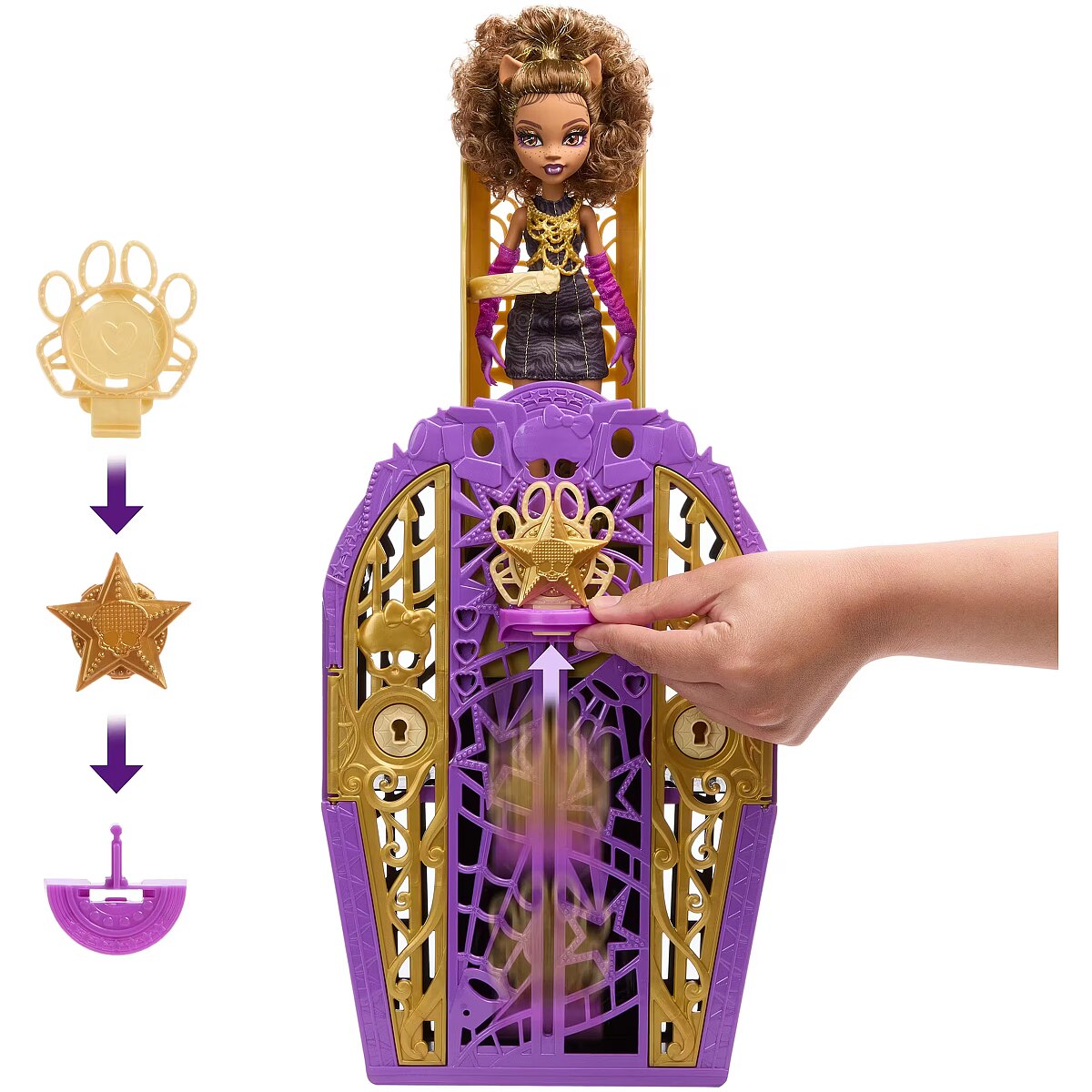 Description - Monster High Straszysekrety Clawdeen Wolf Rozwiąż zagadkę, otwórz bramę Hollyduch i odkryj lalkę Monster High w zestawie z serii Straszysekrety Tajemnice Hollyduch! Pobaw się w detektywa i znajdź wskazówki na mapie za pomocą "magicznego" klucza z lupą. Odkryj też ponad 19 stylowych niespodzianek, takich jak błyszczące stroje, eleganckie długie rękawiczki i biżuteria. Po zabawie lalkę, ubranka i akcesoria dla lalki można schować do szafy, która świetnie sprawdza się jako element zabawy i miejsce do przechowywania. Zabawka jest przeznaczona dla dzieci w wieku od 4 lat. Lalki sprzedawane oddzielnie, zależnie od dostępności. Lalka do ustawiania w różnych pozach. Lalki nie stoją samodzielnie. Kolory i elementy dekoracyjne mogą się różnić. Odkryj tajemnicze niespodzianki z zestawem z serii Straszysekrety Tajemnice Hollyduch! Znajdziesz tu lalkę Clawdeen Wolf, szafę oraz zadziorne ubranka i akcesoria. Clawdeen Wolf wybrała się na wycieczkę do Hollyduch, ale nikt nie może jej znaleźć! Wypatruj wskazówek, aby odnaleźć jej kryjówkę oraz ponad 19 niespodzianek. Odkrywaj w 3 emocjonujących krokach: rozwiąż zagadkę, otwórz szafę i odsłoń niespodzianki! Od czego zacząć? Użyj klucza z lupą, aby ujawnić symbole na mapie do skarbu. Gdy otworzysz drzwi szafy, w skrywanych w niej niespodziankach znajdziesz elementy z symbolami pasującymi do tych na mapie. Te elementy są schowane wśród akcesoriów doskonałych na wyjście na czerwony dywan. Złóż wszystkie trzy elementy w talizman. Zamocuj talizman u podstawy szafy, a potem przesuń go w górę niczym suwak, aby odsłonić lalkę Clawdeen Wolf w stylizacji z pazurem! Ten niesamowity moment możesz powtarzać wciąż od nowa! Clawdeen Wolf już się znalazła, więc czas szykować się na wieczór! Dzięki ponad 125 możliwościom stylizacji z elementami do dowolnego łączenia możesz urozmaicić wieczorne wyjścia wieloma zadziornymi zmianami garderoby. Oszałamiające sekrety kryją się w cieniu blasku Hollyduch! Sprawdź całą kolekcję Straszysekrety Tajemnice Hollyduch i odkryj więcej strasznie modnych lalek Monster High. Sprzedawane oddzielnie.