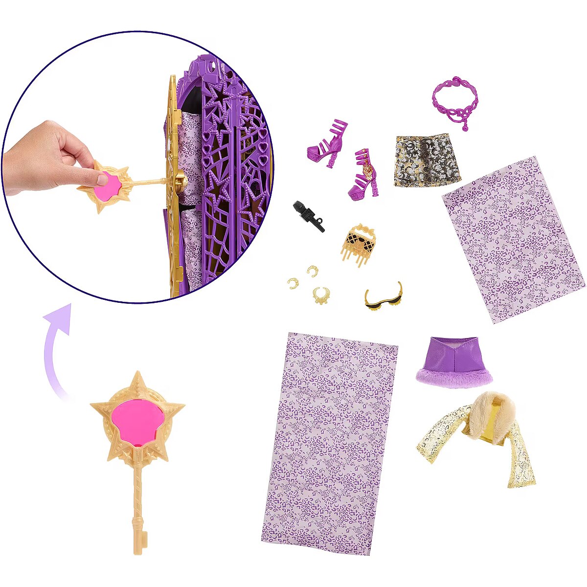 Accessories included - Lalka Clawdeen Wolf Szafa z dwojgiem drzwi Klucz 2 mapy 3 elementy do złożenia talizman-klucz 2 wieszaki oraz różne ubranka i akcesoria