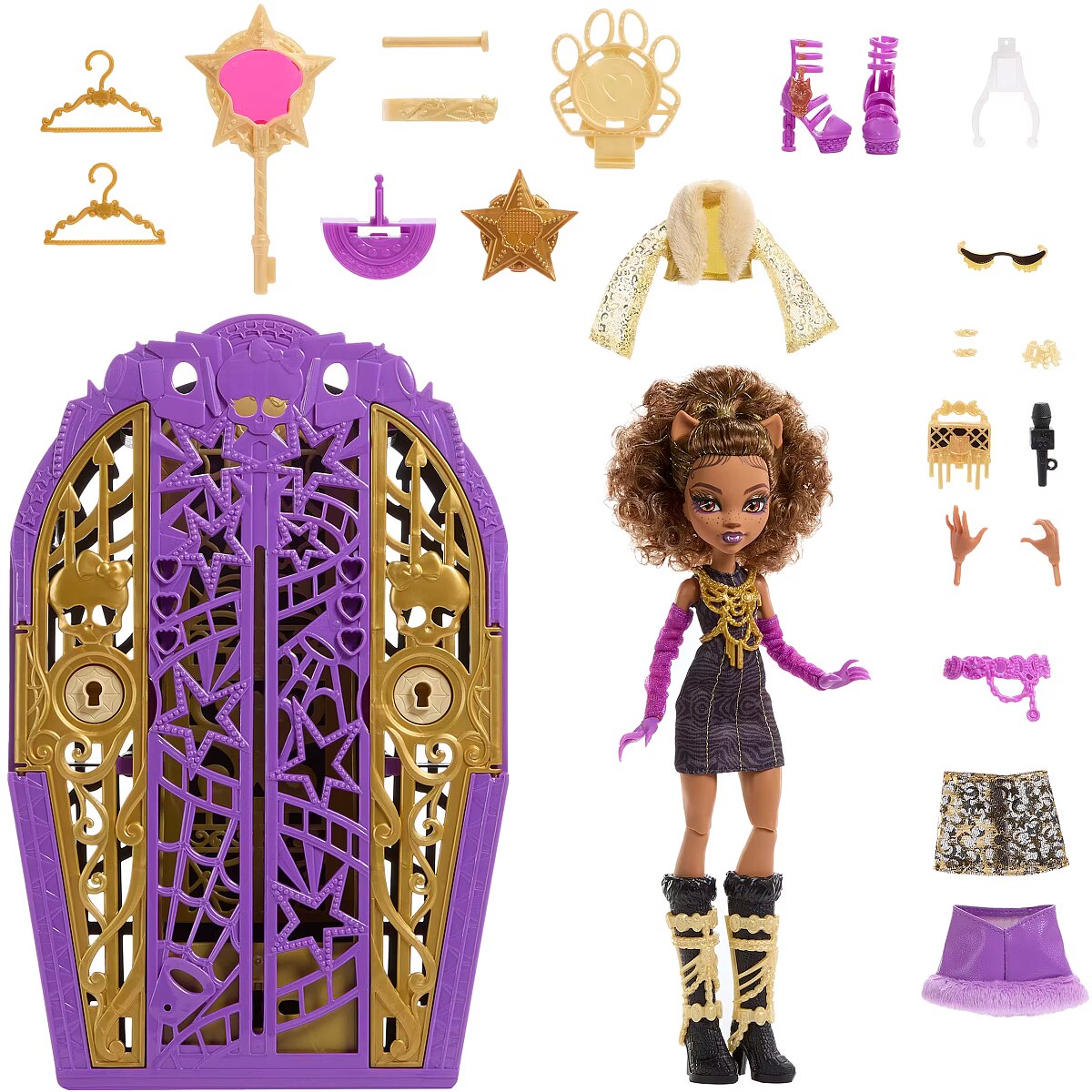 Packaging content - Packaging content - Includes 1 Clawdeen Wolf doll, 1 closet with two doors, 1 key, 2 maps, 3 charms, 2 hangers, and assorted clothing and accessories. Doll cannot stand alone. Colours and decorations may vary.