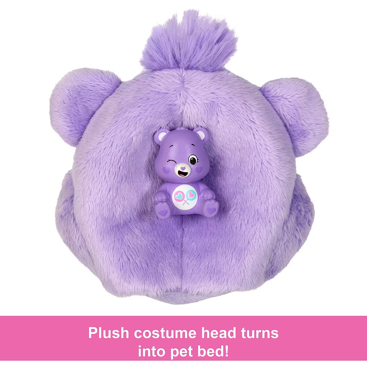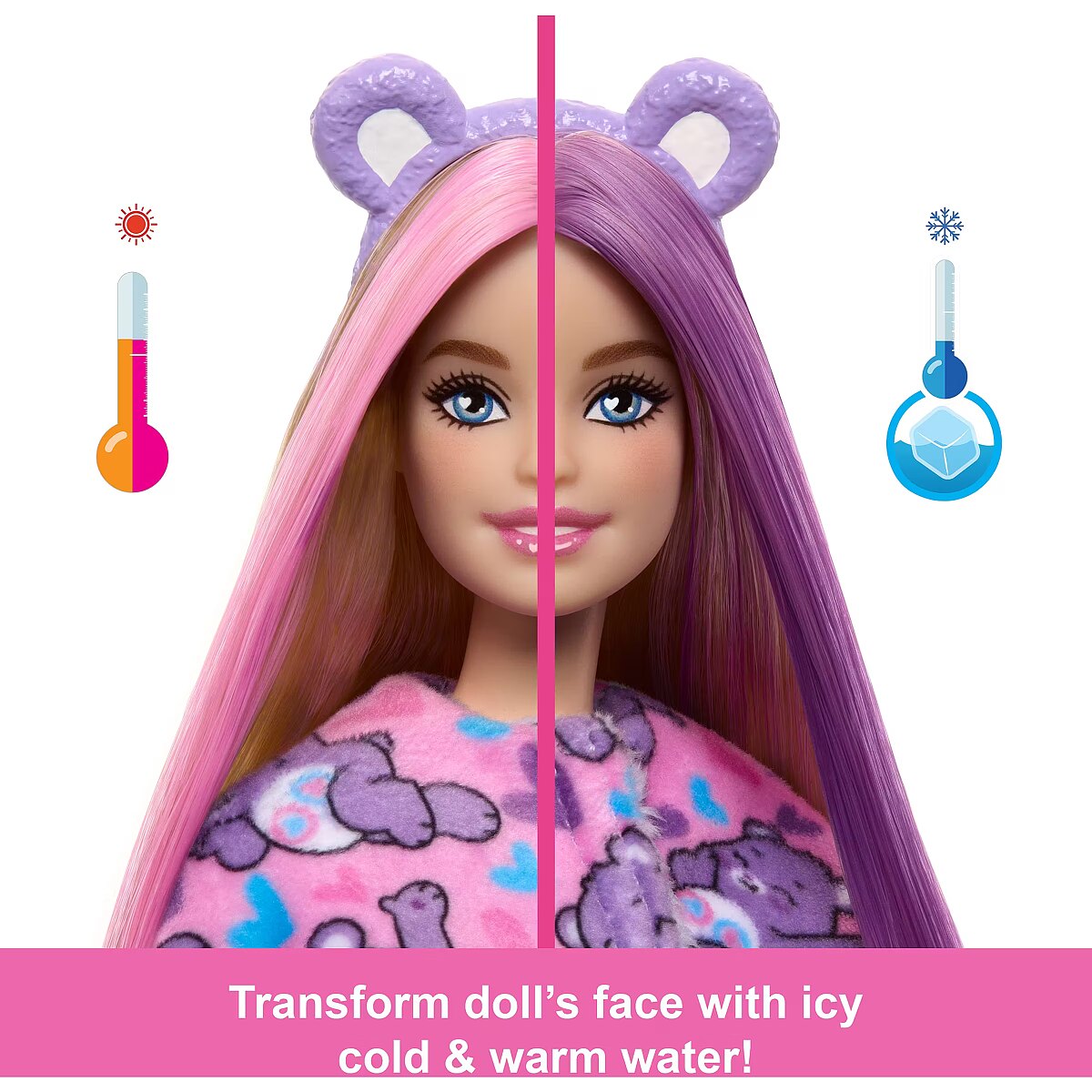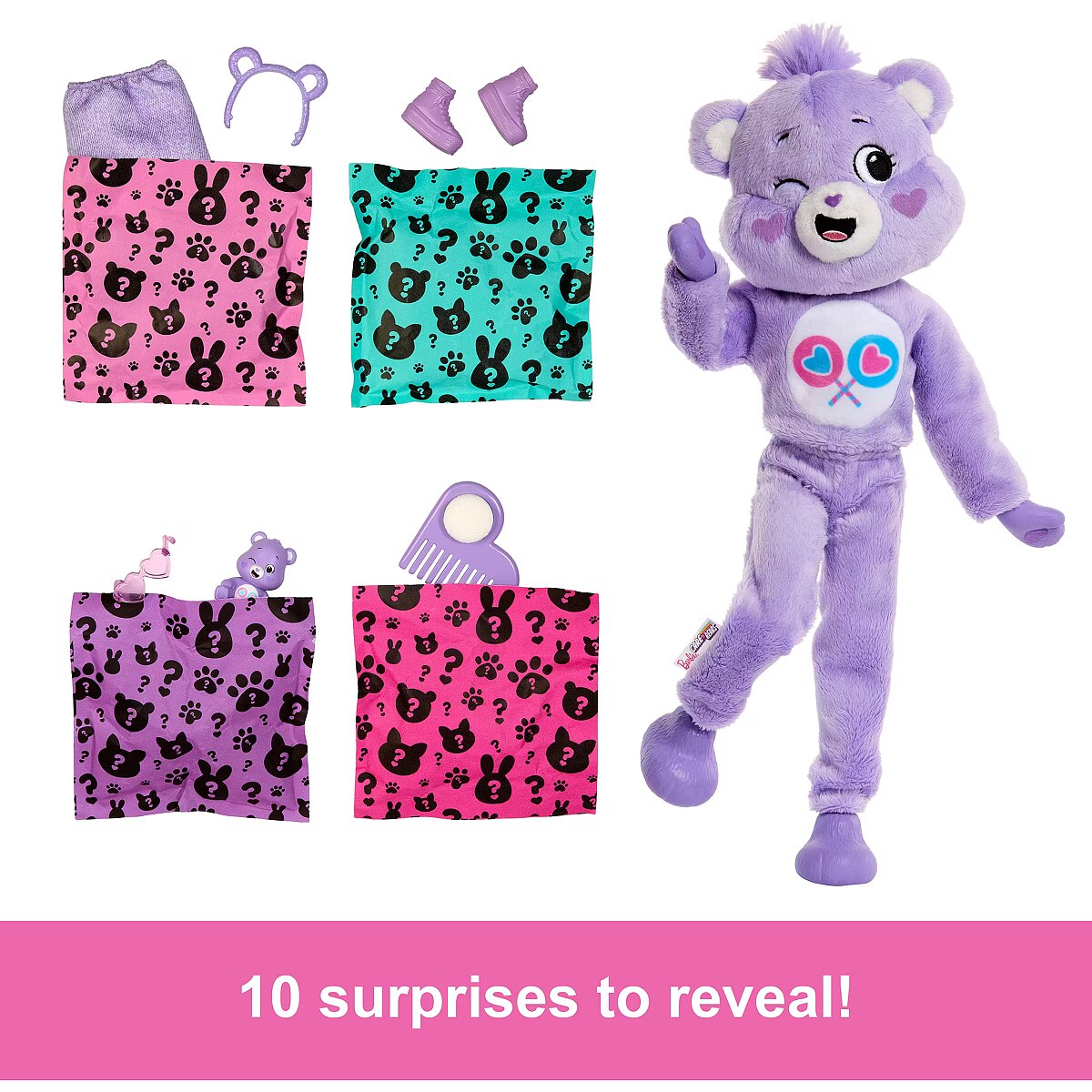 LongDesc - Barbie Cutie Reveal Care Bears dolls offer the cutest unboxing experience with 10 surprises! Discover one of three different Care Bears characters -- Cheer Bear, Share Bear or Grumpy Bear. Remove the adorable plush costume to reveal a posable Barbie doll. Which doll will you reveal? Then find more surprises like a skirt, headband, sunglasses, shoes, sponge-comb and matching mini Care Bear! Reverse the plush top for a fleece jacket and flip the costume head for a pet bed. Use water for even more cuteness with repeat colour-change transformations on the doll's hair! Kids will love discovering -- and collecting -- all the cute surprises in this adorable series. Each doll sold separately, subject to availability. Dolls cannot stand alone. Colours and decorations may vary.